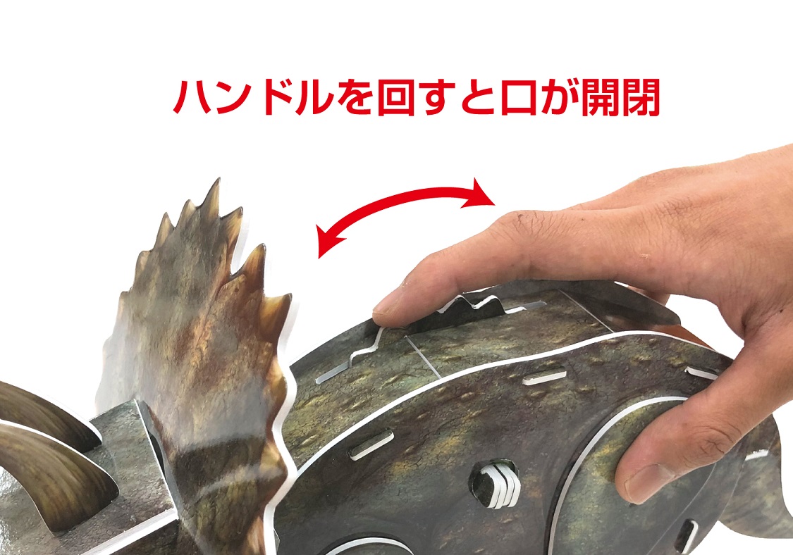 また、背中のハンドルを回すと口が開閉し、組み立てた後も立体恐竜として楽しめる仕掛け付き。