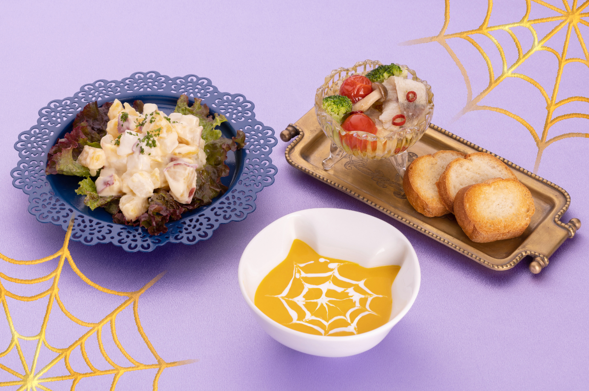 鱈やブロッコリー、キノコが入ったアヒージョや、角切りのしゃきしゃき食感が楽しめる大根とさつまいものサラダ、豆乳でまろやかに仕立てたパンプキンスープが用意されるセイボリー。