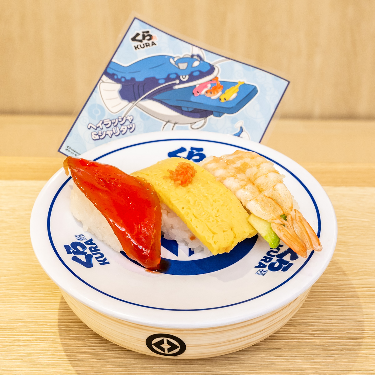 ぎたいポケモンシャリタツの、そったすがた、たれたすがた、のびたすがたとヘイラッシャをイメージしたお寿司と、ピカチュウをイメージした期間限定のオリジナルメニューが提供されます。