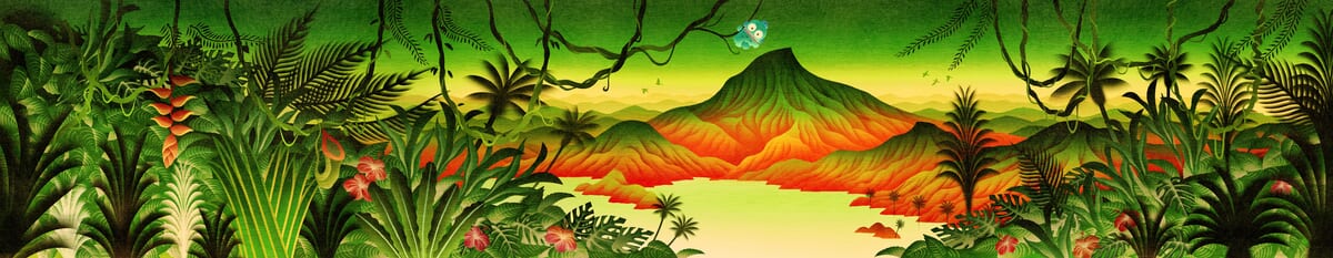 銭湯内でひときわ目を引くペンキ絵に描かれた、密林をかき分けた先に広がる壮大な山。
