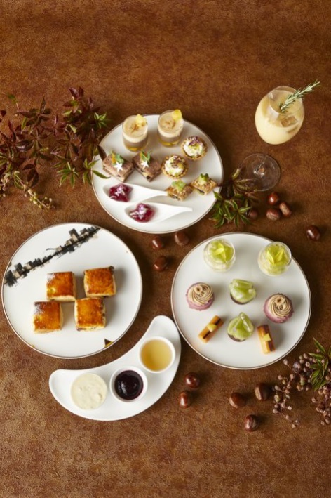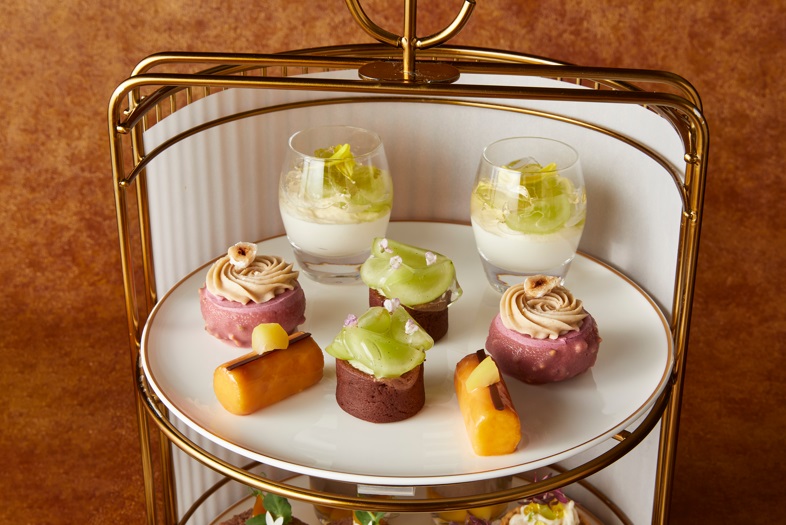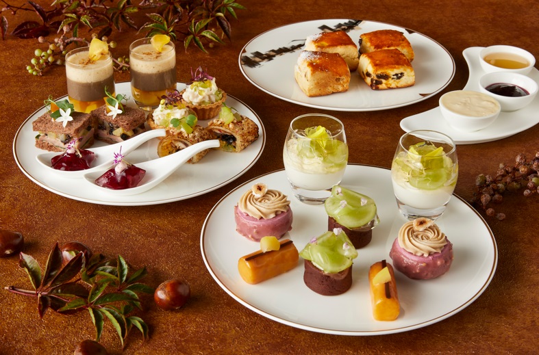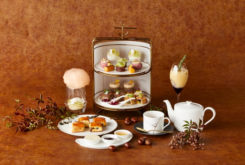 23階「ロビーラウンジ」では、秋の味覚の代表格である栗やぶどうを使ったアフタヌーンティーが提供されるほか、3階「喫水線」では枯山水をイメージした和風アフタヌーンティーも登場。