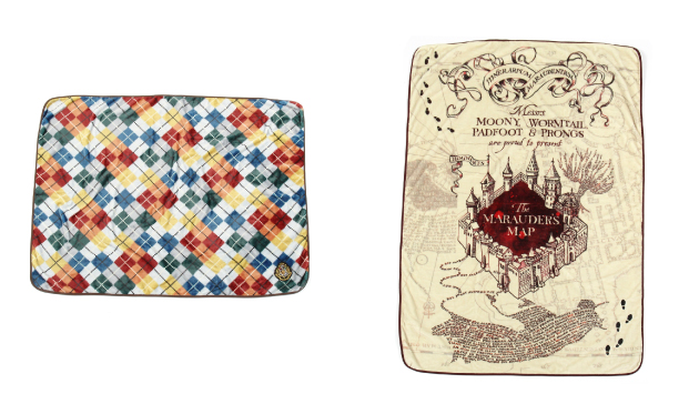 「ホグワーツ魔法魔術学校」の4寮をイメージしたアーガイル柄と、作中に登場するアイテム「忍びの地図」柄のブランケット。