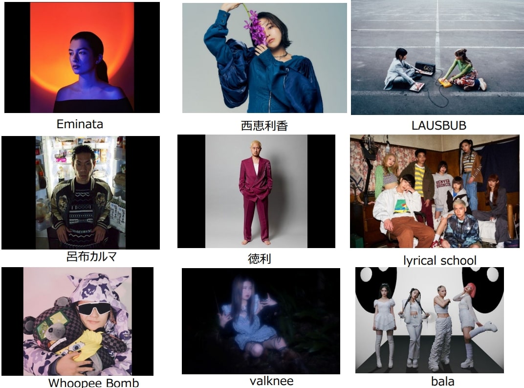 Eminata、西恵利香、LAUSBUB、呂布カルマ、徳利、lyrical school、Whoopee Bomb、valknee、bala、