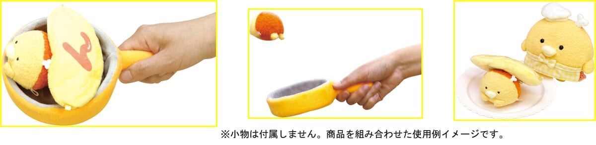 ミニフライパンを使ってノリノリでオムライスを作りごっこができるぬいぐるみです。