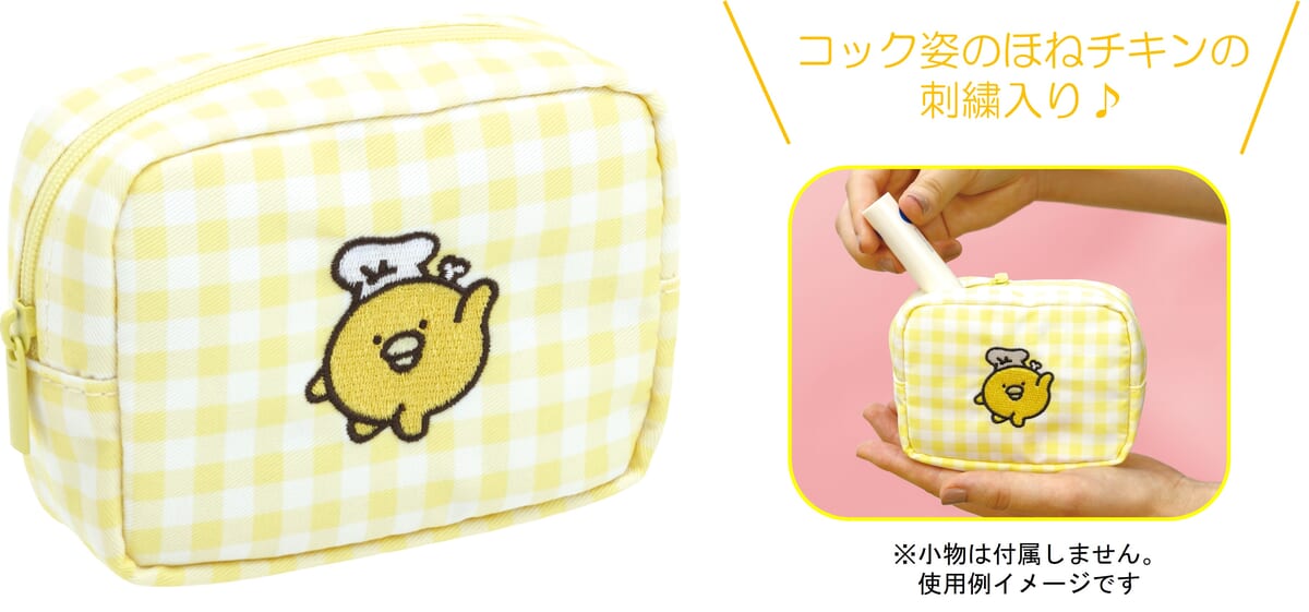 コック帽をかぶった「ほねチキン」の刺繍が目を引くポーチ。