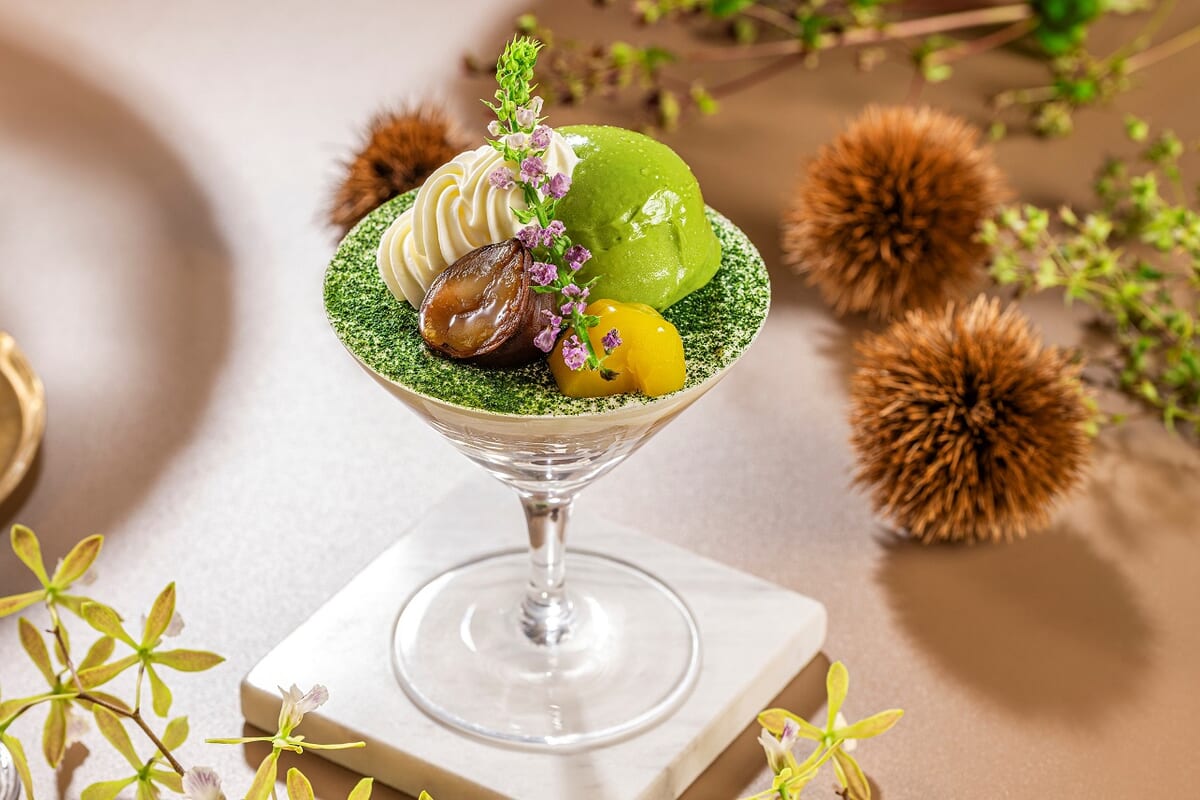 栗の渋皮煮や甘露煮に、上質な栗ペーストやモンブランクリームを絞り、ほろ苦い抹茶アイスを贅沢にのせたかわいらしいパフェです!