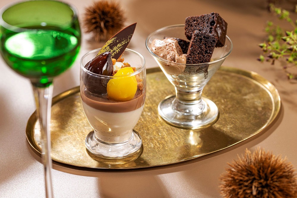 「マロンパンナコッタ&ジュレショコラ」は、ほんのりラムが香るマロンパンナコッタに、2種類のマロンをトッピングした口当たりの良いグラスデザート。