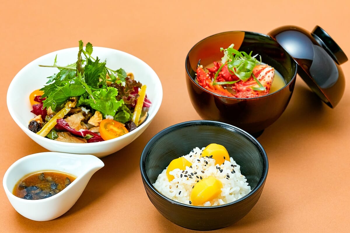 ライトミールには「栗ご飯」や濃厚な味わいの「花咲ガニの味噌汁」「きのことベビーリーフのサラダ」など、思わずほっとする秋の味覚を提供。