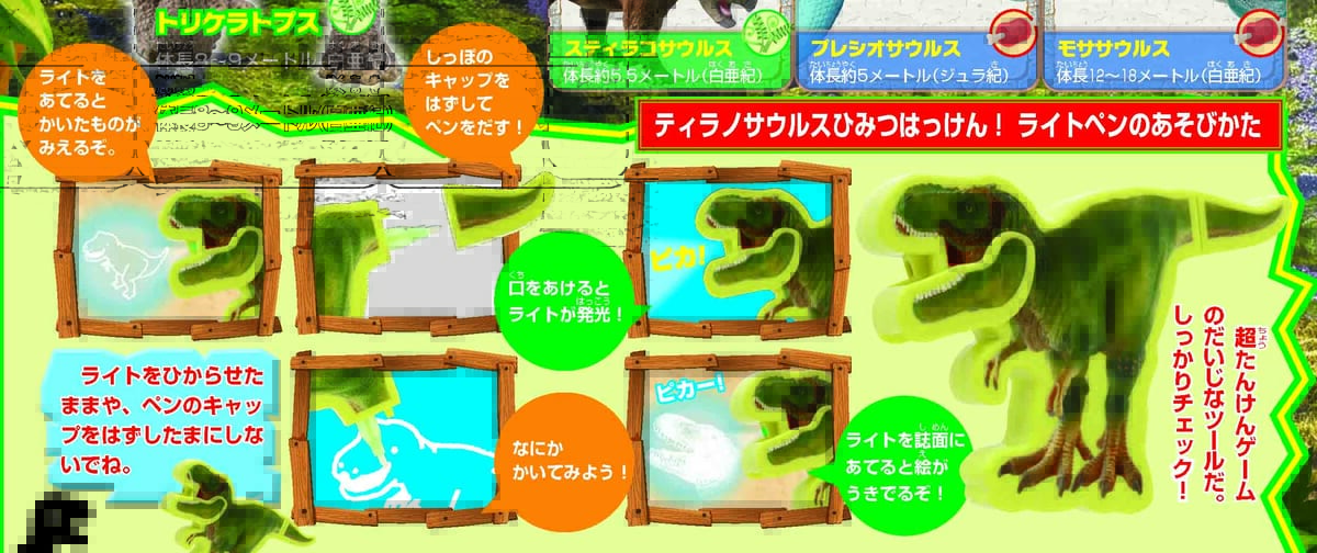 ティラノサウルスのかっこいいイラストがプリントされたライトペンは、口を開けるとブラックライトが点灯し、誌面の指定の位置を照らすと、かくれている絵や文字が浮かび上がります。