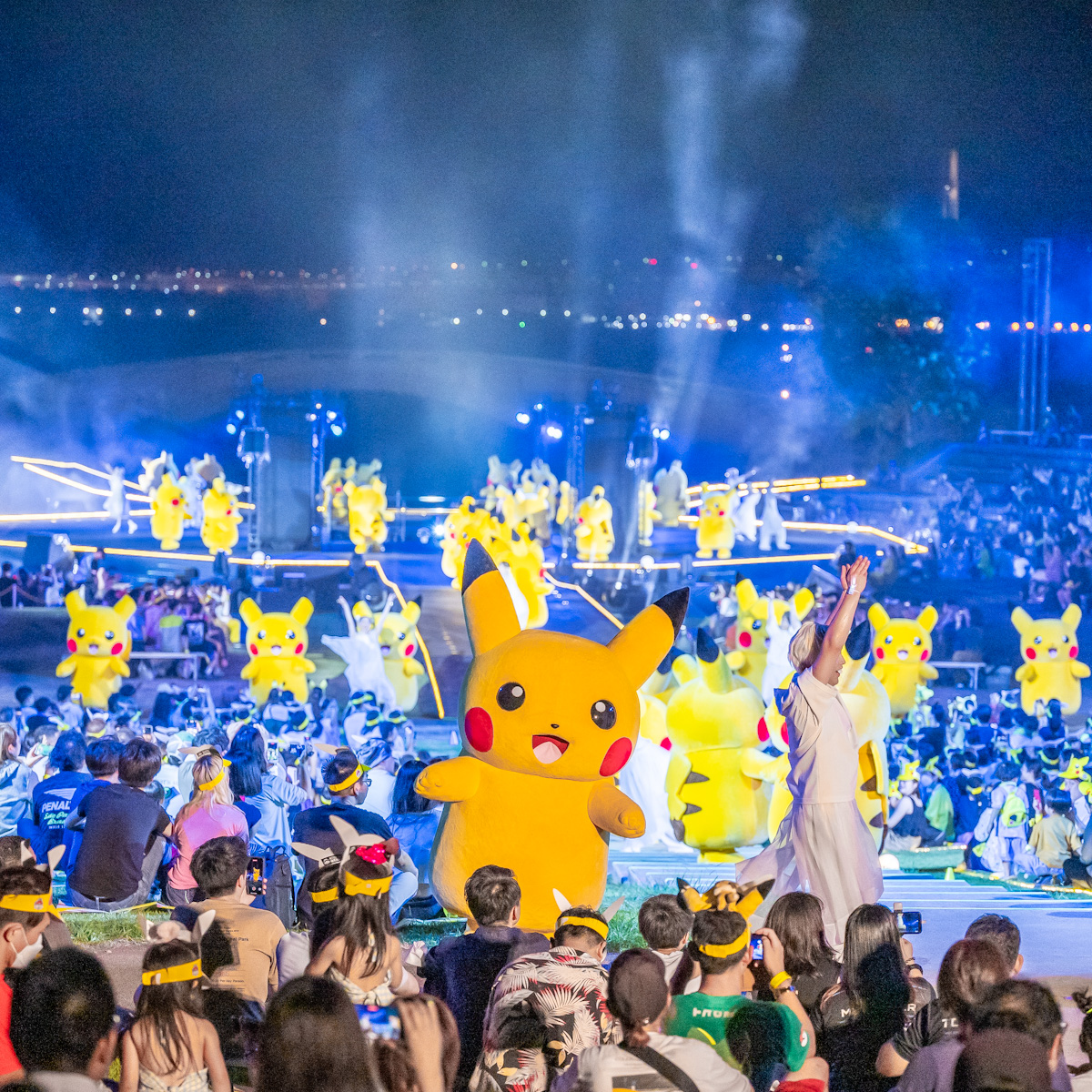 臨港パークにたくさんのピカチュウが登場し、ダンサーと一緒にかわいいダンスで盛り上げます。