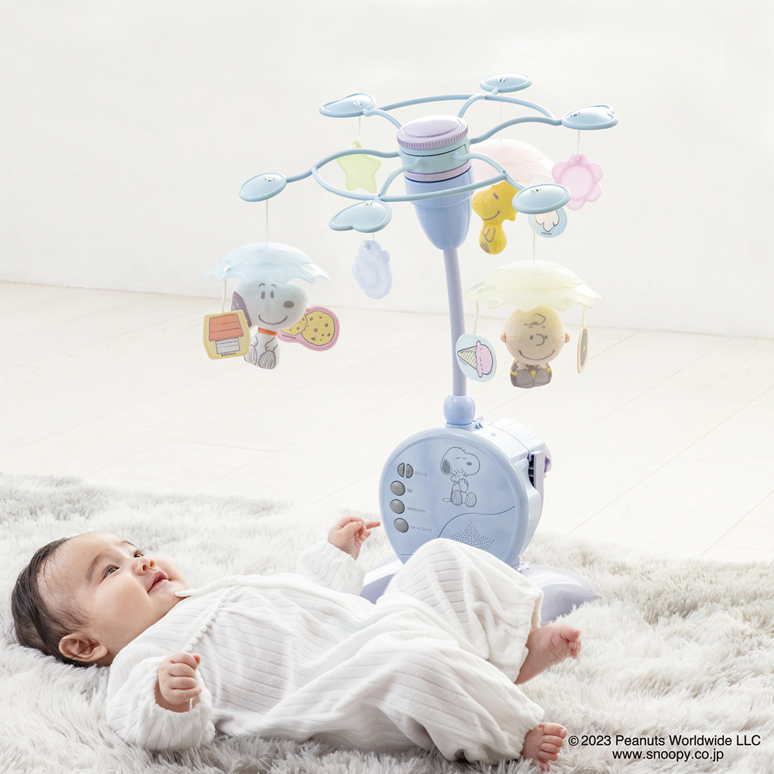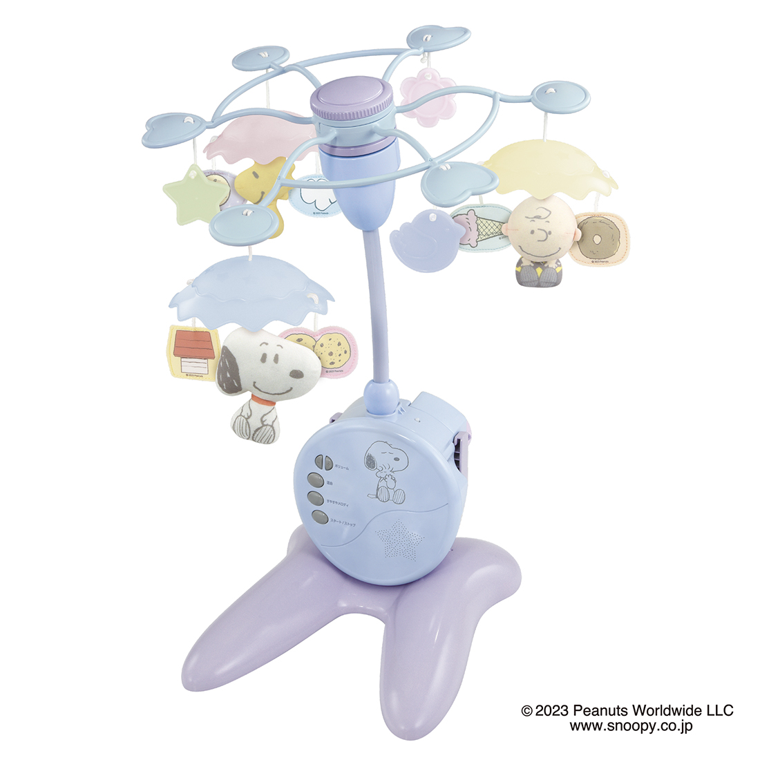 傘と一緒に「スヌーピー」たちが回るメリーには、優しいメロディ全10曲と心安らぐ環境音全3種が収録されています。