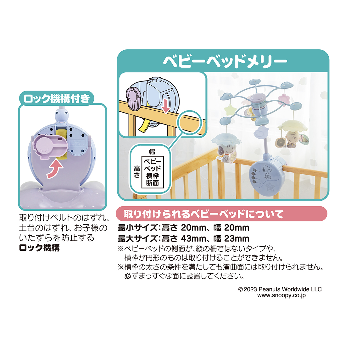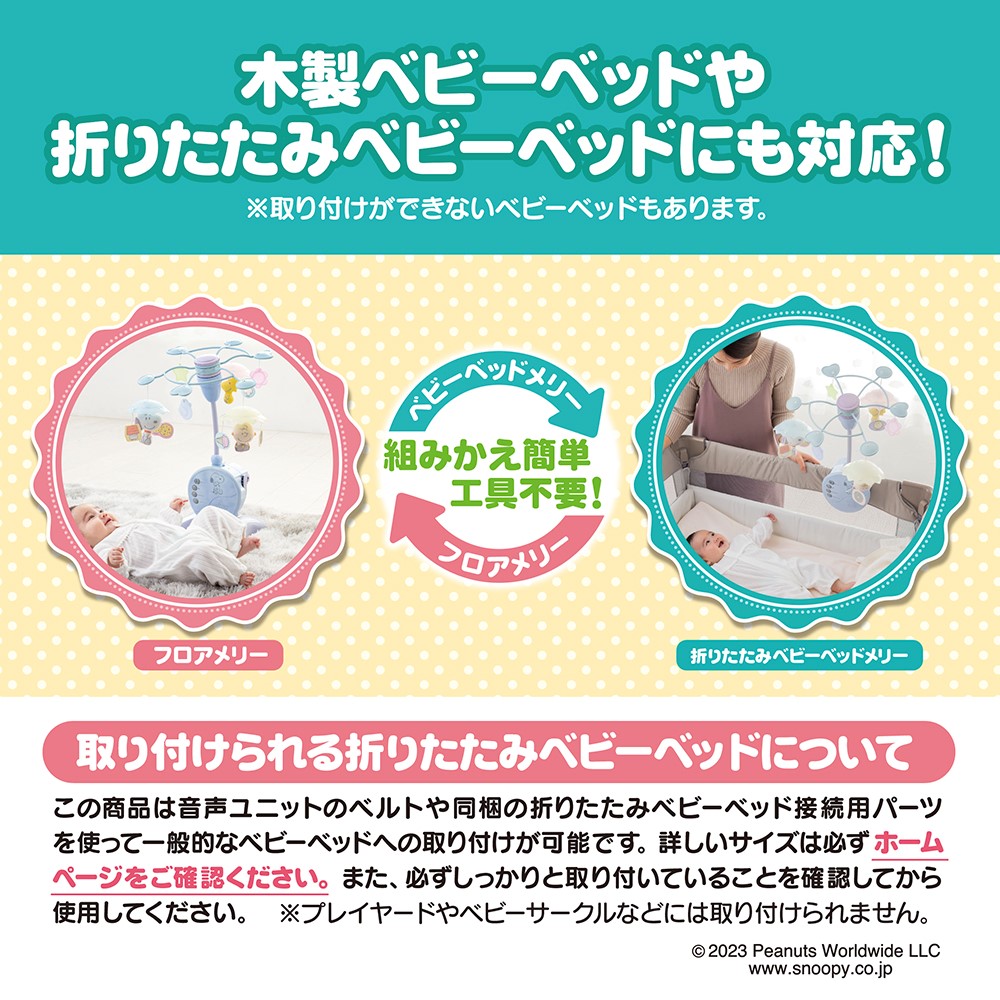 ベビーベッドとフロアで使え、ガラガラとしても遊べる「スヌーピー」の3wayメリー。