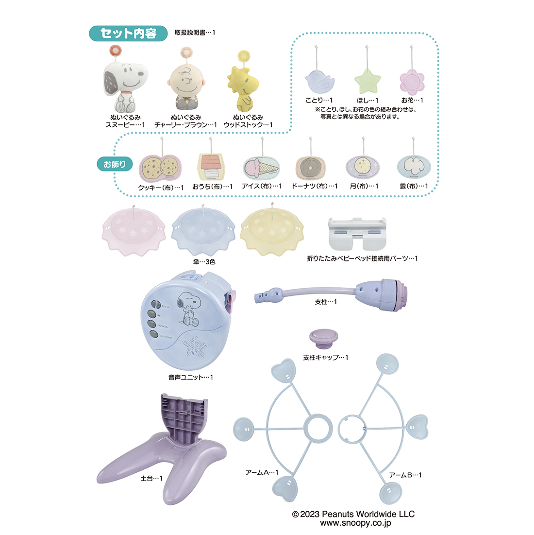 セット内容:取扱説明書、ぬいぐるみ3種(スヌーピー、チャーリー・ブラウン、ウッドストック)、お飾り(ことり、ほし、お花、クッキー(布)、おうち(布)、アイス(布)、ドーナツ(布)、月(布)、雲(布))、傘3色、折りたたみベビーベッド接続用パーツ、音声ユニット、土台、支柱、支柱キャプ、アームA・B