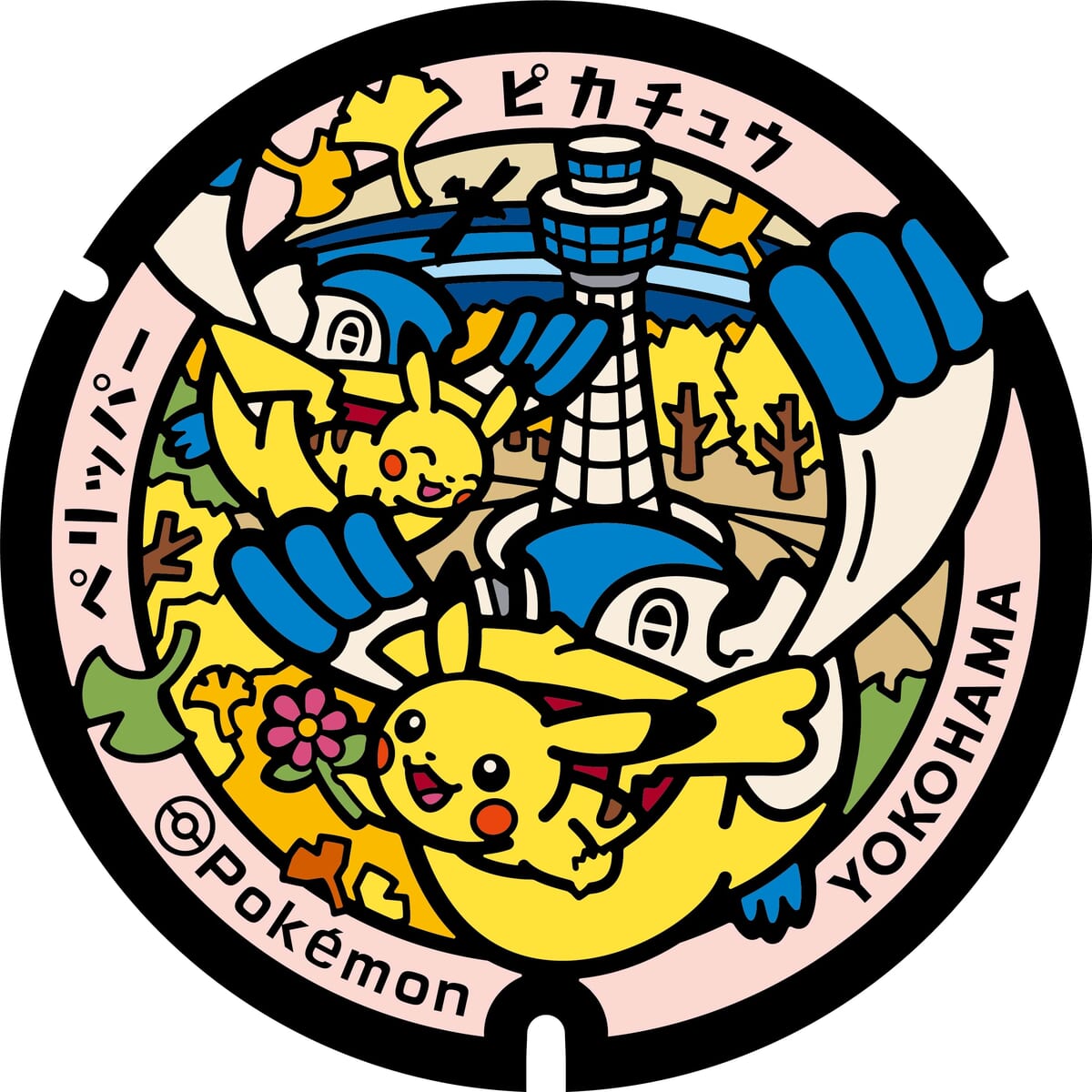 横浜の魅力的な観光スポットや、「ピカチュウ」をはじめさまざまなポケモンたちが描かれたポケモンマンホールです。