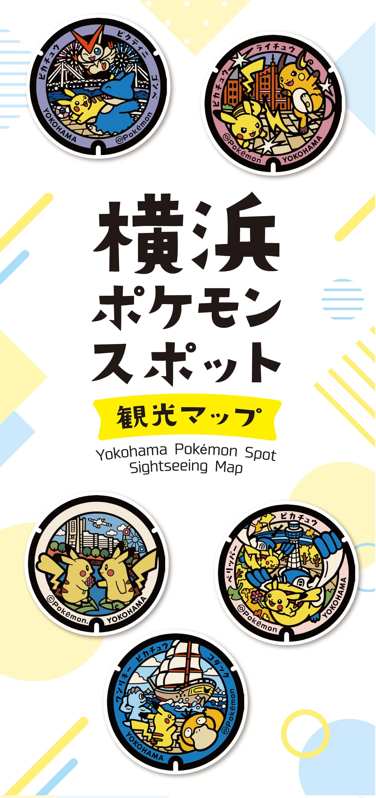 横浜の魅力的な観光スポットのイメージや、「ピカチュウ」をはじめさまざまなポケモンたちが描かれたポケモンマンホール。