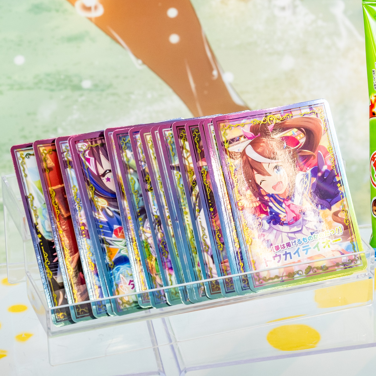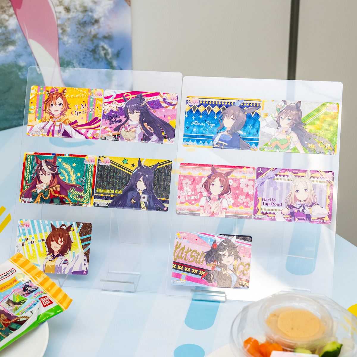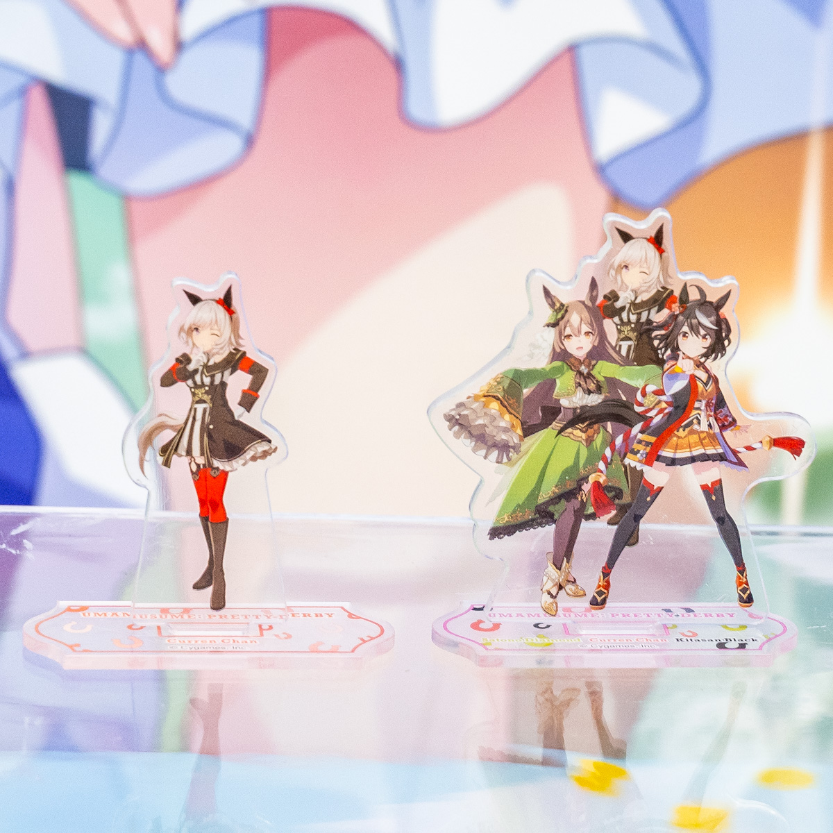 キタサンブラック、サトノダイヤモンド、カレンチャンのオリジナルデザインパッケージに、オリジナルデザインのミニアクリルスタンド(全2種類)1個が入ったグミです。