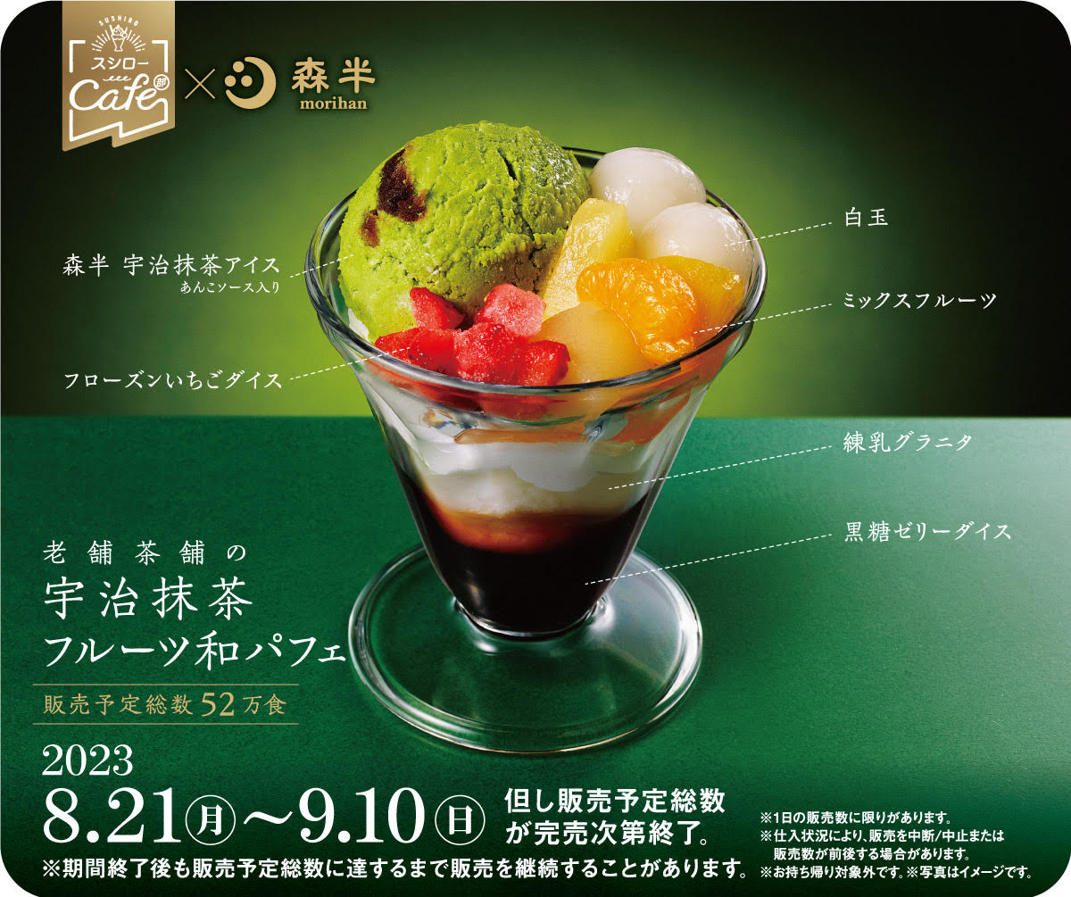 スシローから、「スシローカフェ部」と、180年以上続く京都宇治の老舗茶舗「森半」のコラボレーションスイーツ第3弾が登場。