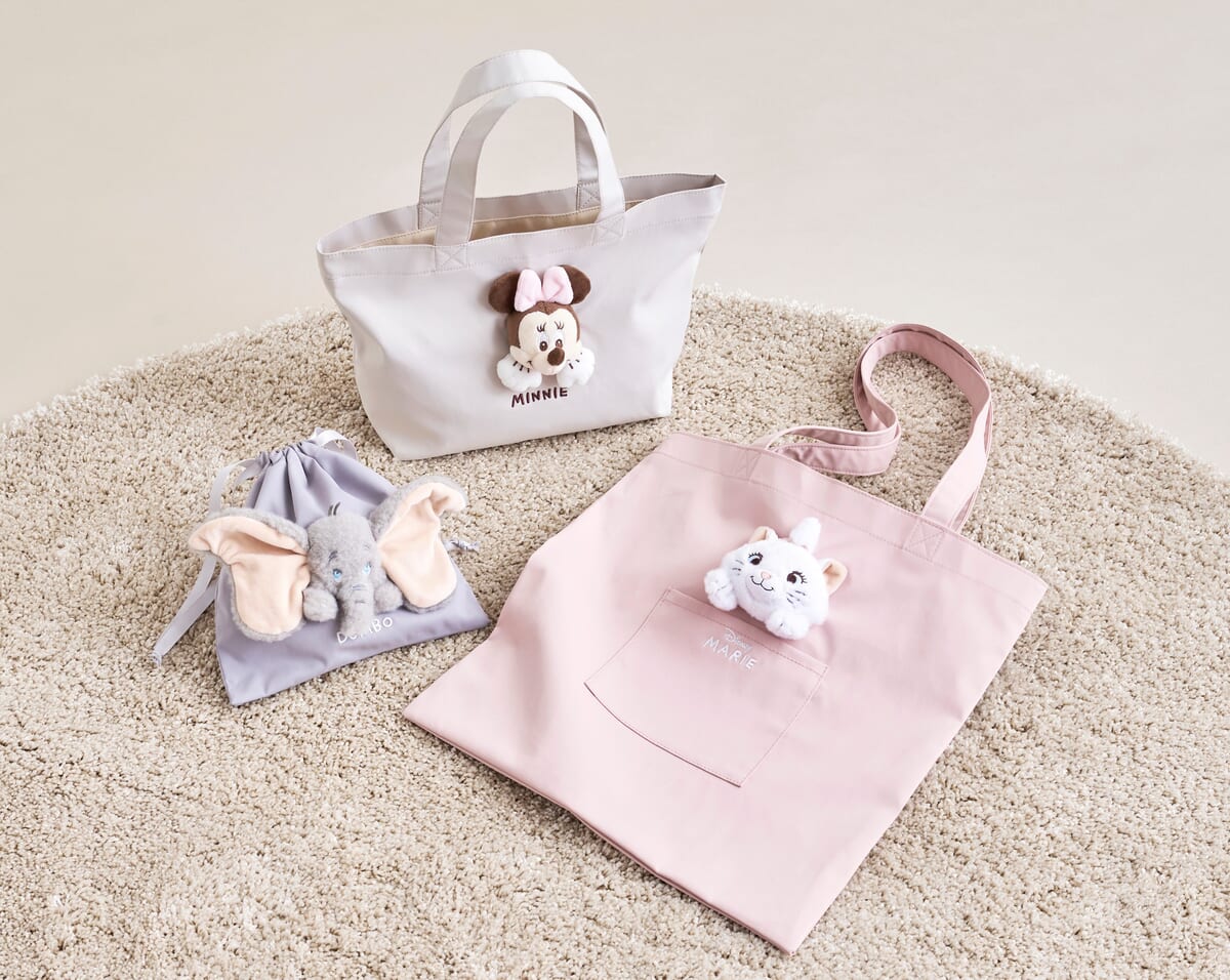 「ミニーマウス」「マリー」「ダンボ」のキャラクターフェイスが立体的に再現された、トートバッグや巾着をラインナップ!