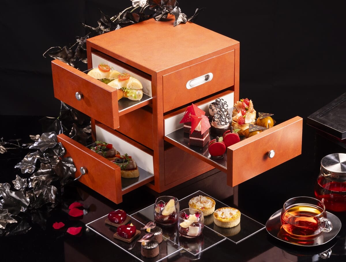 ジュエリーケースのようなアフタヌーンティーボックスに詰められたスイーツが楽しめます。