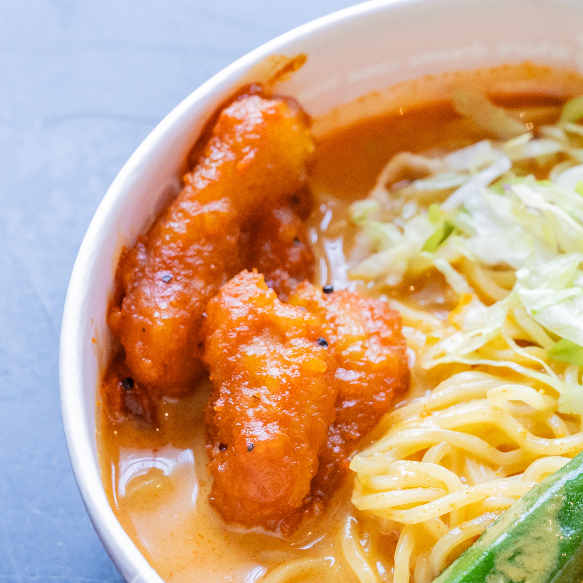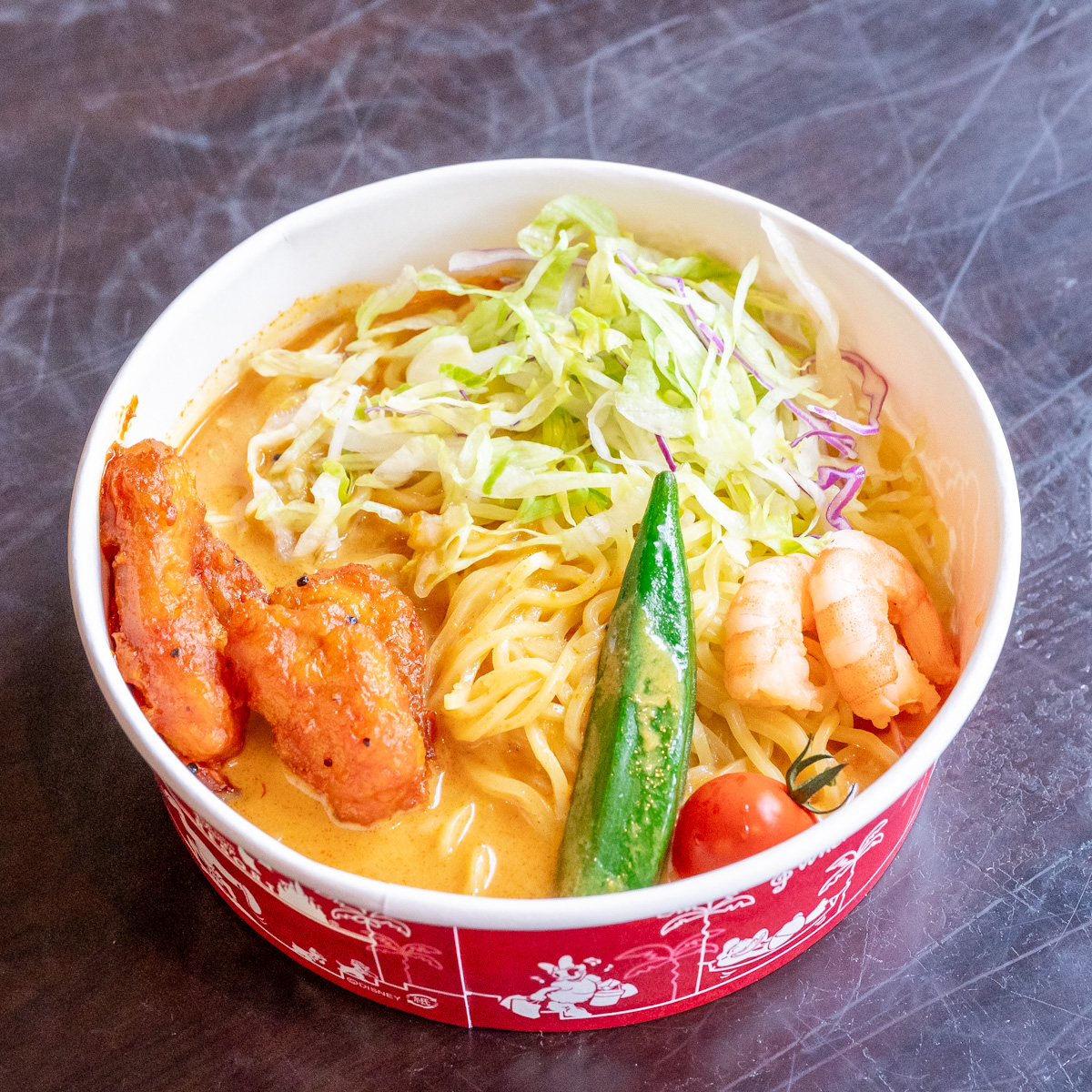 マイルドな味わいのタレで仕上げたヌードルの上に、オクラ、ミニトマト、エビ、サラダ、チキンをトッピング。