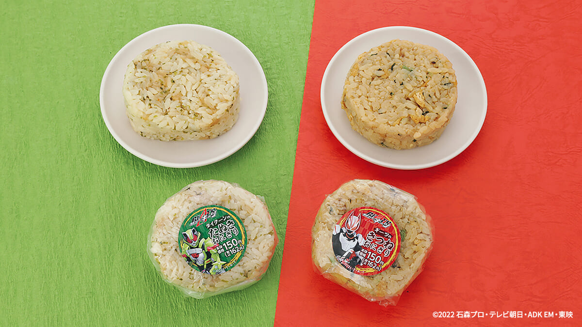 「仮面ライダーギーツ」のモチーフである「きつね」と、「仮面ライダータイクーン」のモチーフである「たぬき」に倣った具材を使用したおにぎりです。