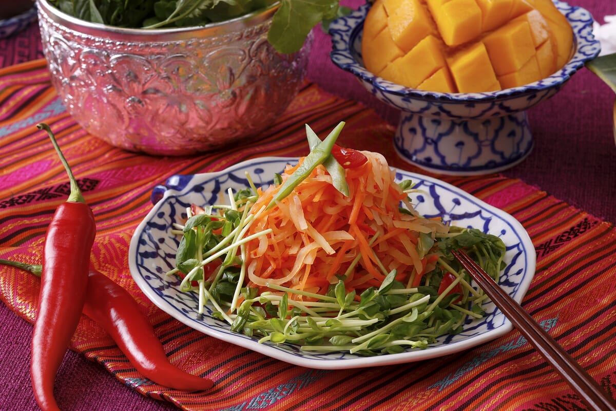 日本では珍しい青パパイヤや、ニンジン、トマト、唐辛子を甘辛いドレッシングであえた、シャキシャキ食感がたまらないタイの家庭料理