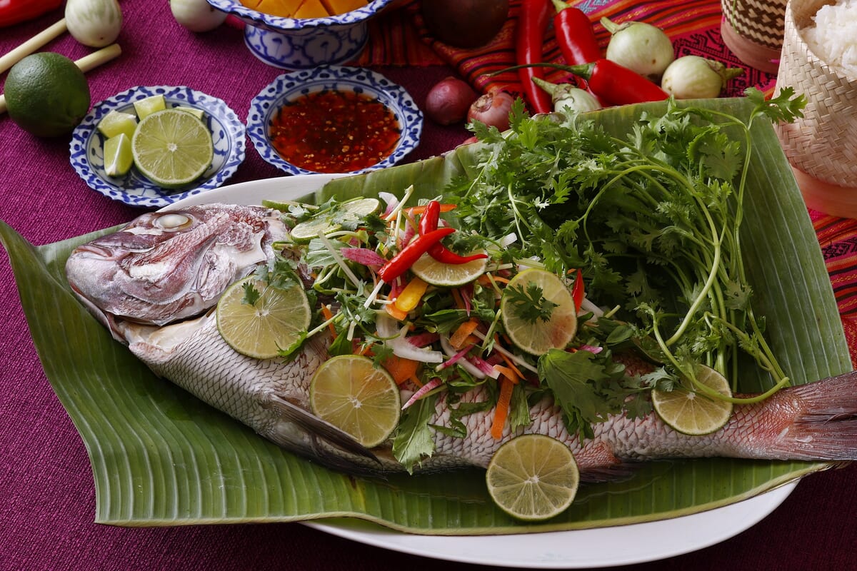 ライムとともに蒸した鯛をナンプラーで味付けした、柑橘が爽やかに香るタイの代表的な魚料理