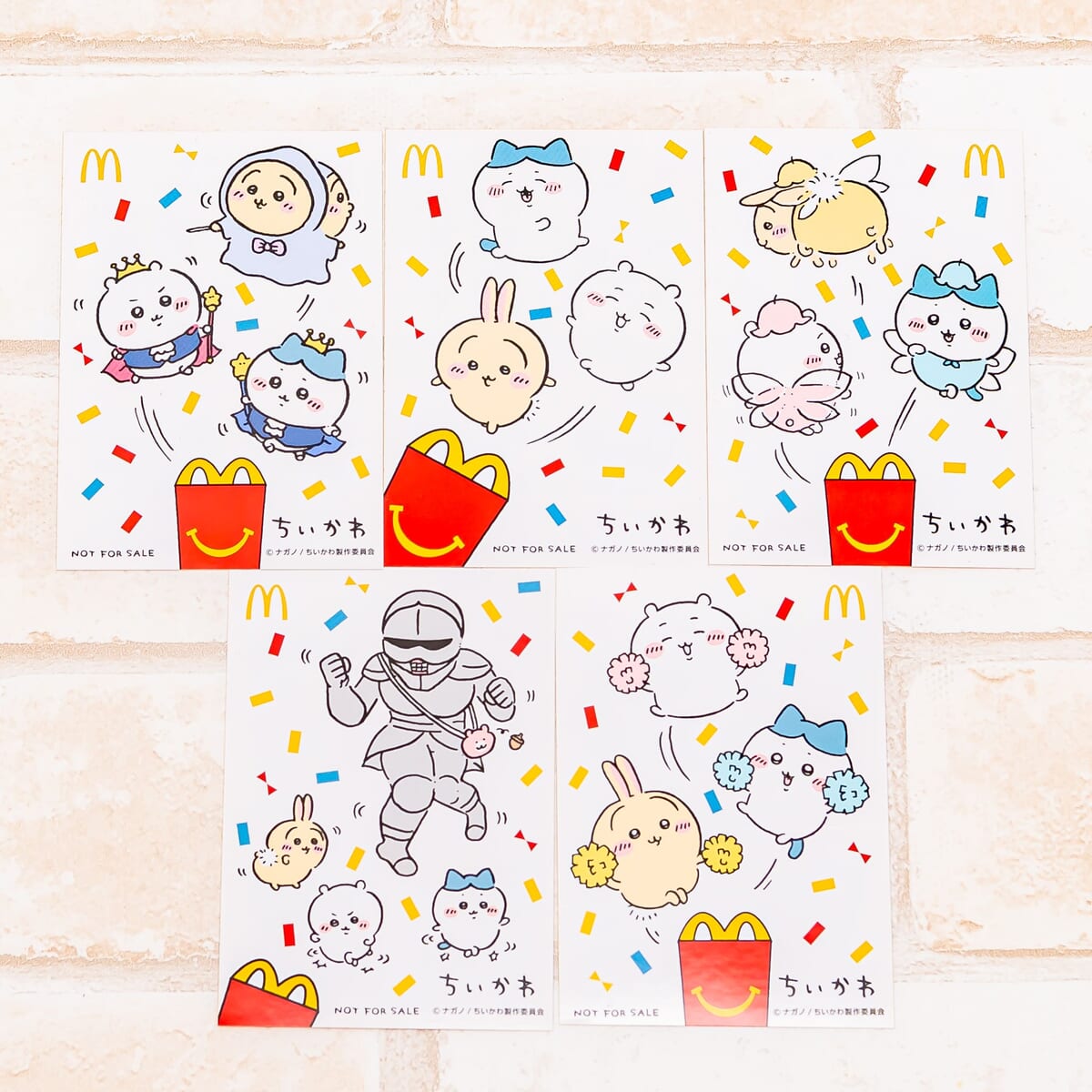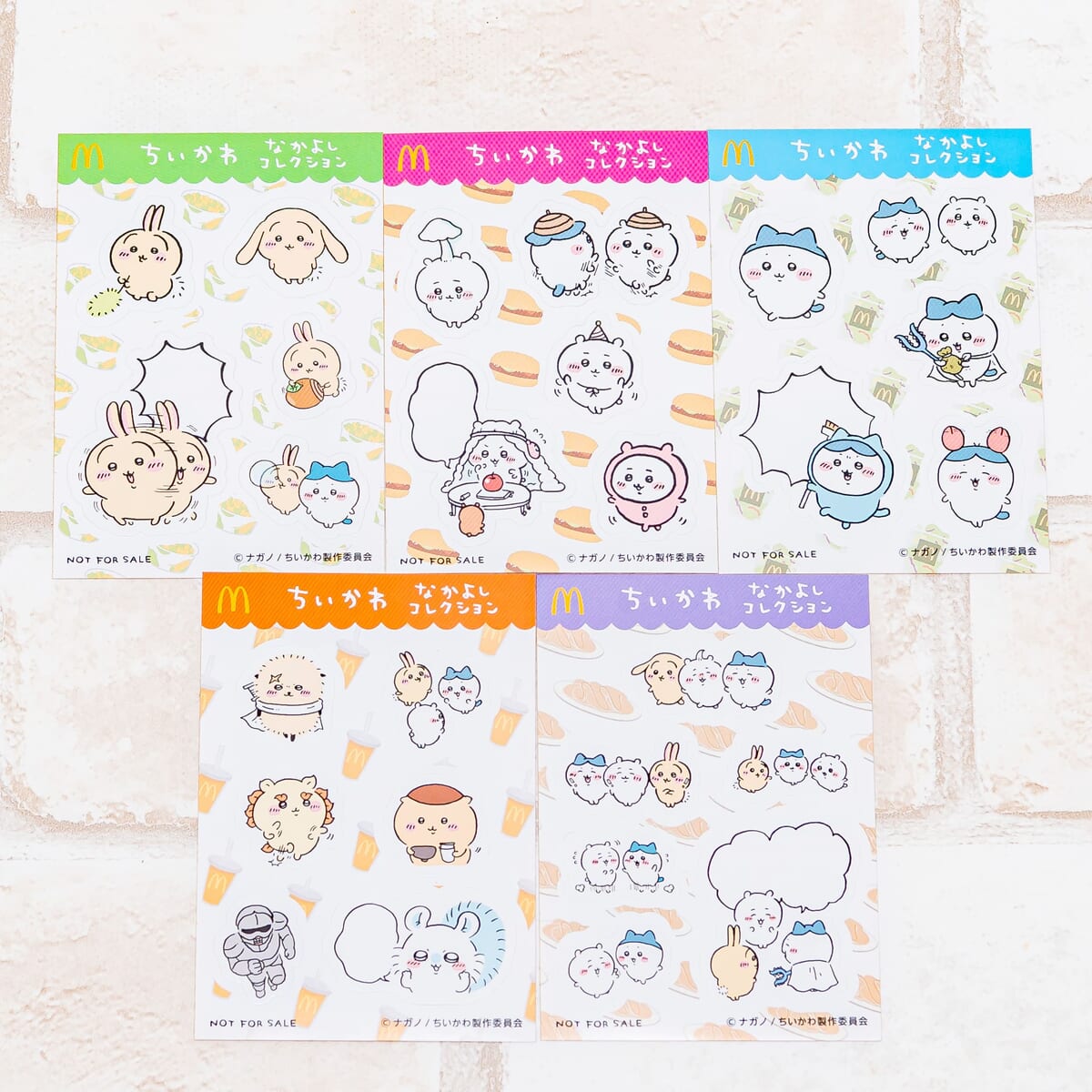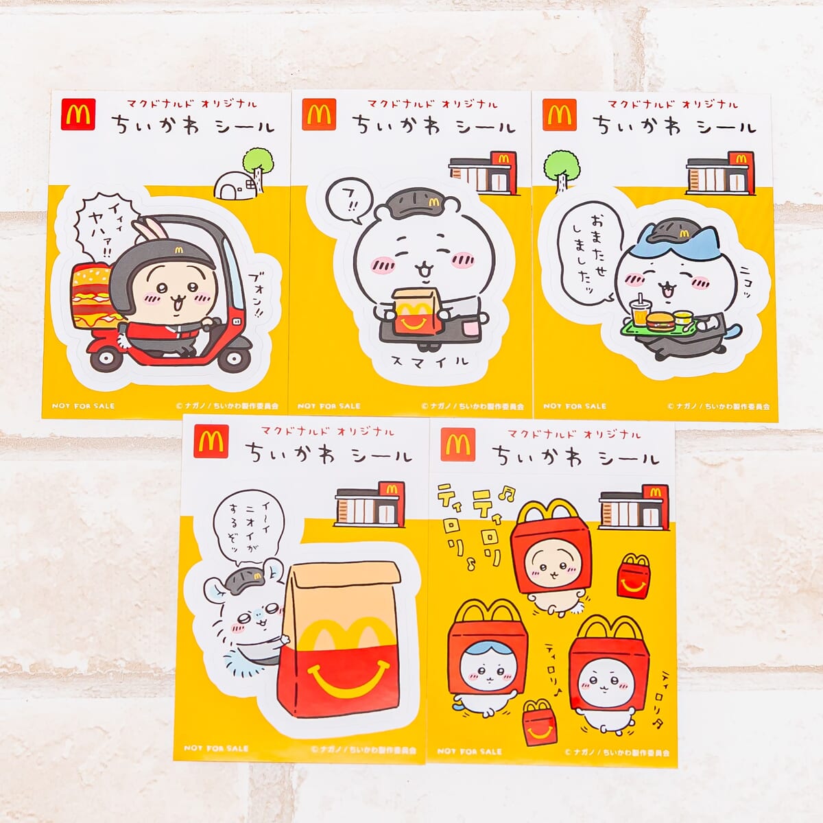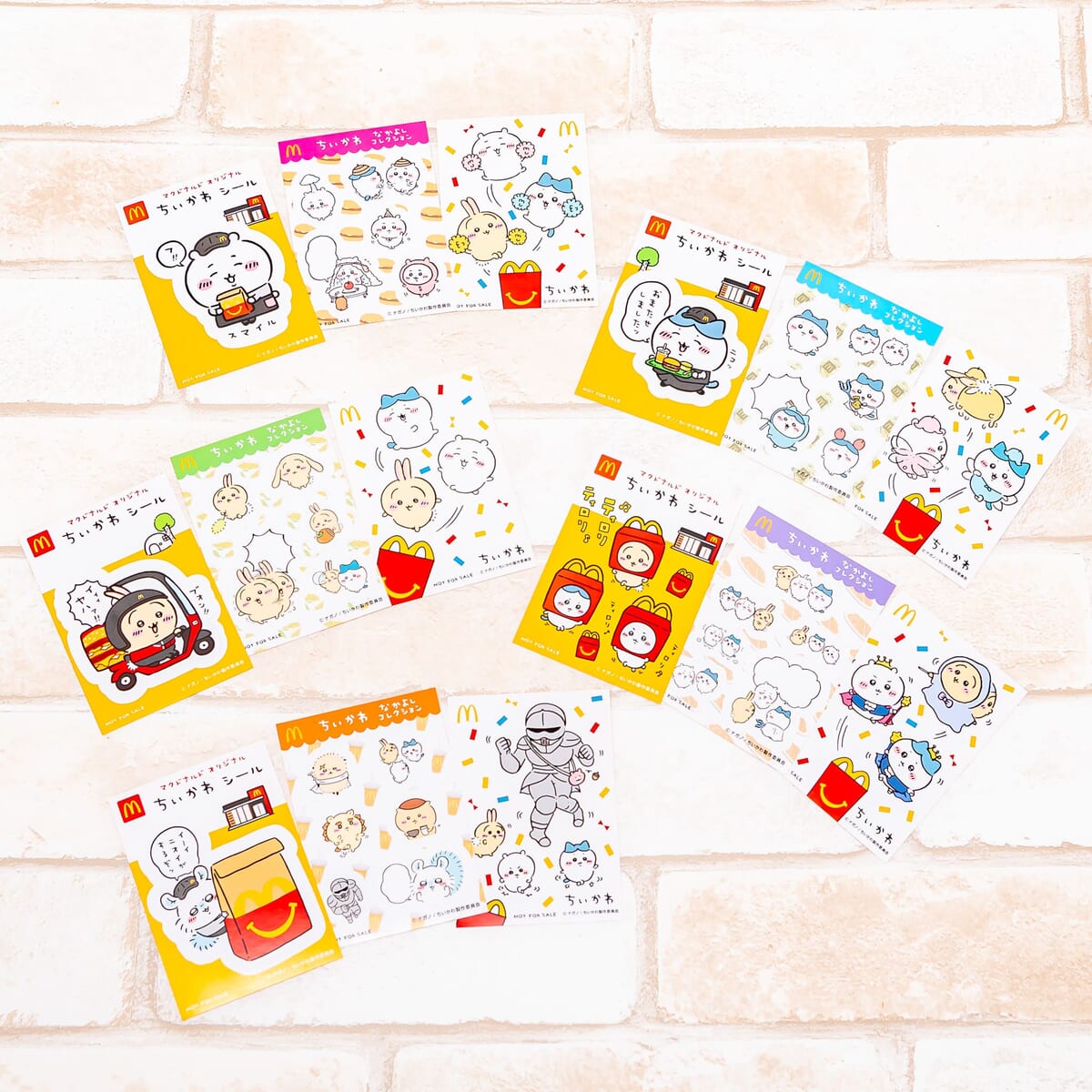 「ちいかわ」や「ハチワレ」「うさぎ」などのマクドナルドオリジナルデザインのシールを含む3枚組シールセットが全5種類ラインナップされます☆