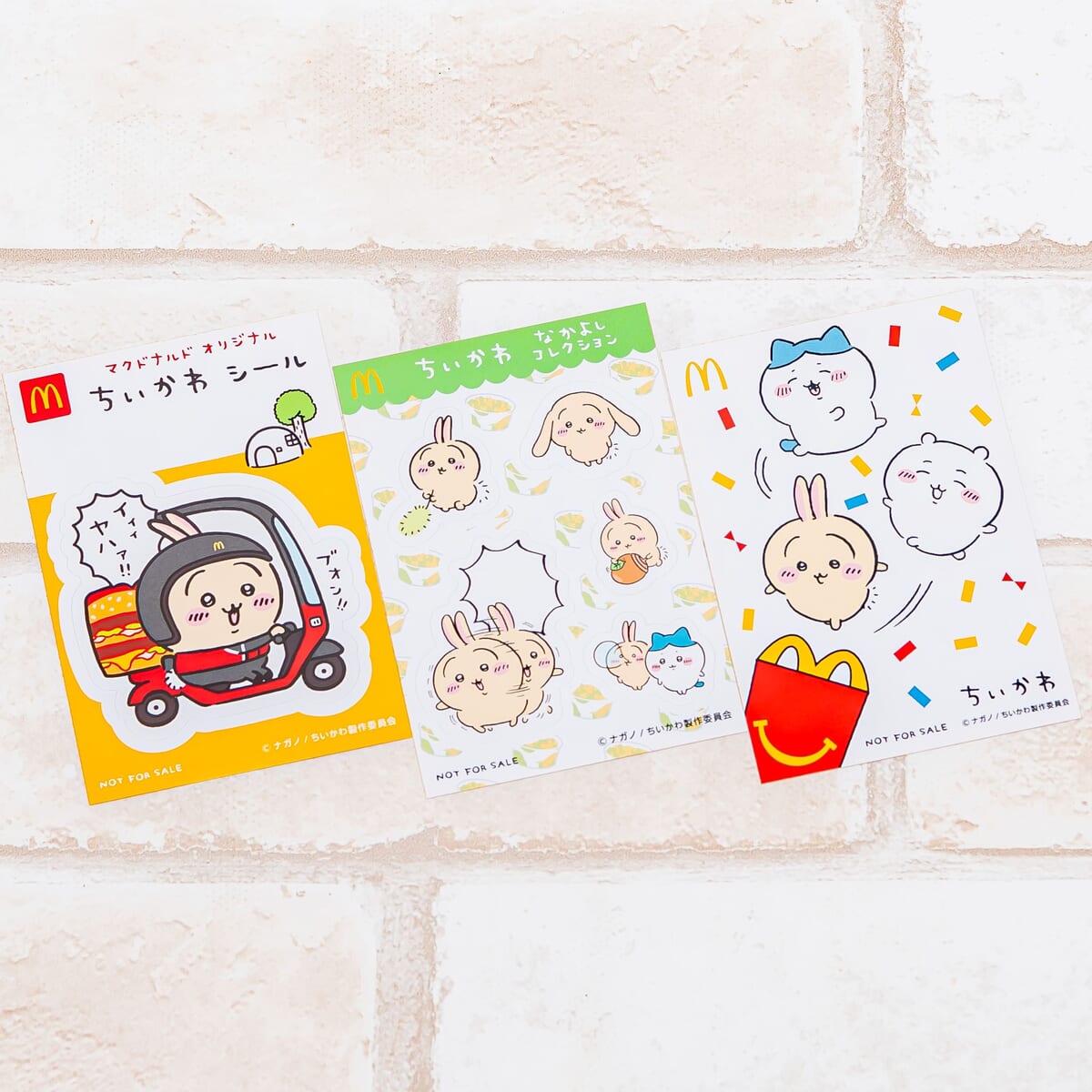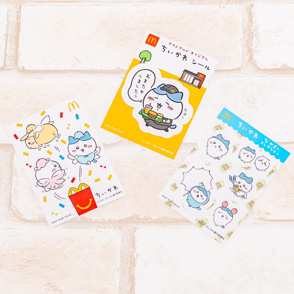 マクドナルドオリジナルデザインのシールに加え、「なかよし コレクション」や「ちいかわ」たちの賑やかなデザインなど3枚が入っています。