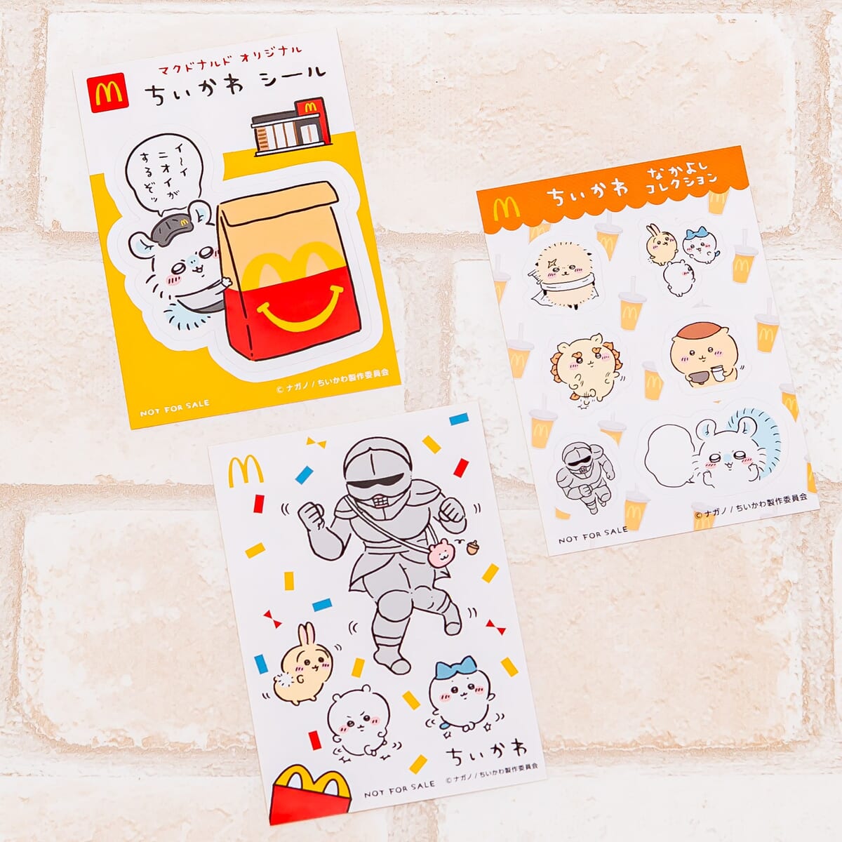 「ちいかわ」や「ハチワレ」「うさぎ」などのキャラクターのマクドナルドオリジナルデザインのシール1枚を含む3枚組のシールセットで、全5種類が展開されます。