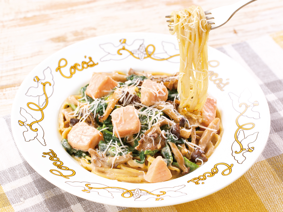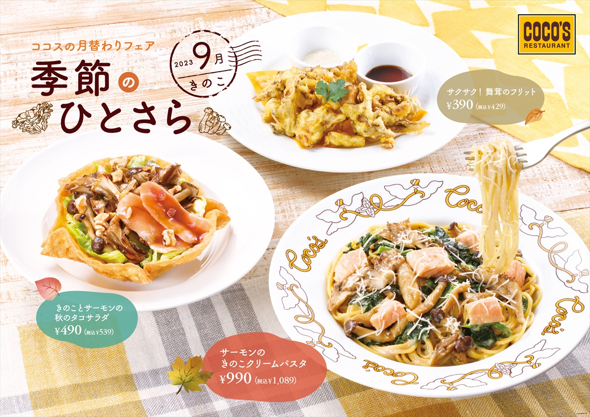きのこと相性が良いサーモンとクリームソースを組み合わせた「サーモンのきのこクリームパスタ」と、食べ応えのある大ぶりカットの“舞茸”をシンプルに味わう「サクサク!舞茸のフリット」、ココスの定番サラダを秋仕様でお届けする「きのことサーモンの秋のタコサラダ」の3品がラインナップされます。