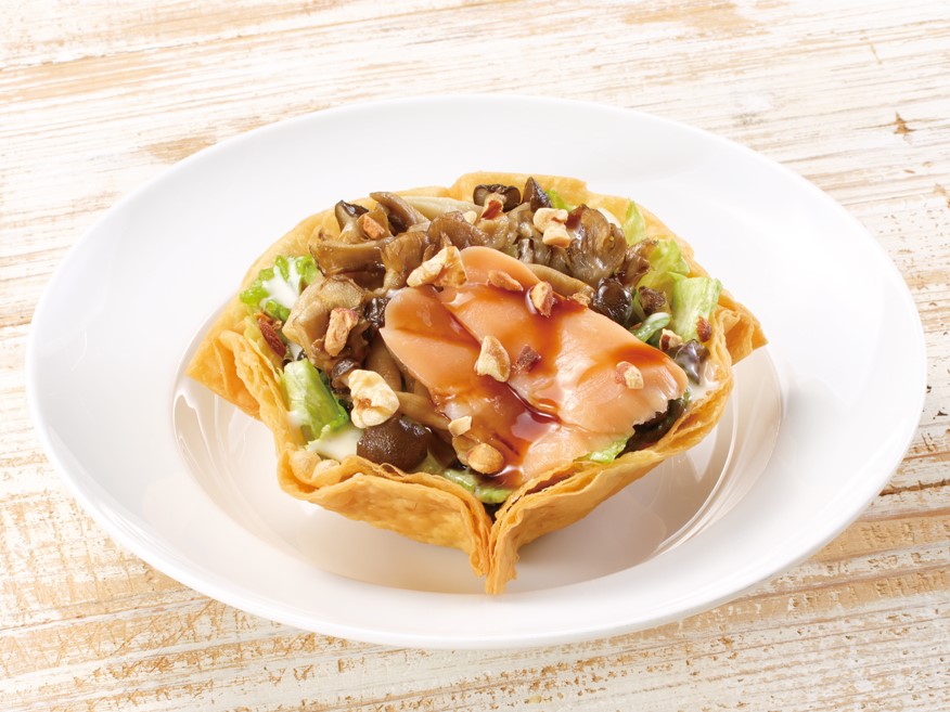 パリパリのシェルに、素揚げしたしめじと舞茸、程よい脂のりのサーモン、香ばしい風味のミックスナッツなどをのせています。