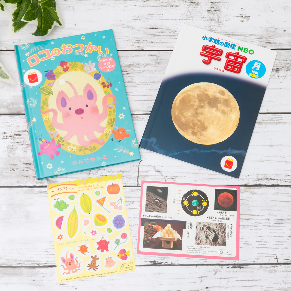 今回は、2023年9月1日(金)から販売される「ほんのハッピーセット」の、絵本「ロコのおつかい」と、ミニ図鑑「宇宙/月特集 クイズつき」を紹介します☆