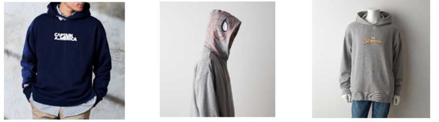 カジュアルウェアは、メンズフェイスデザインパーカ「マーベル」と、キッズプルオーバー「マーベル」をラインナップ。