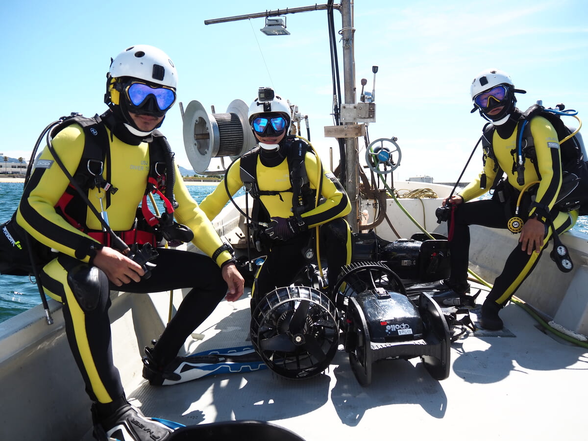 今回の海底調査・清掃では、漁業や養殖の可能性を探る調査および海底ごみの収集を目的に、普段はラグーンの清掃活動や万が一の落下者のレスキュー活動を担当するパークのダイバー(潜水士)3名が、潜水作業で培ったスキルを活かして本活動に協力。