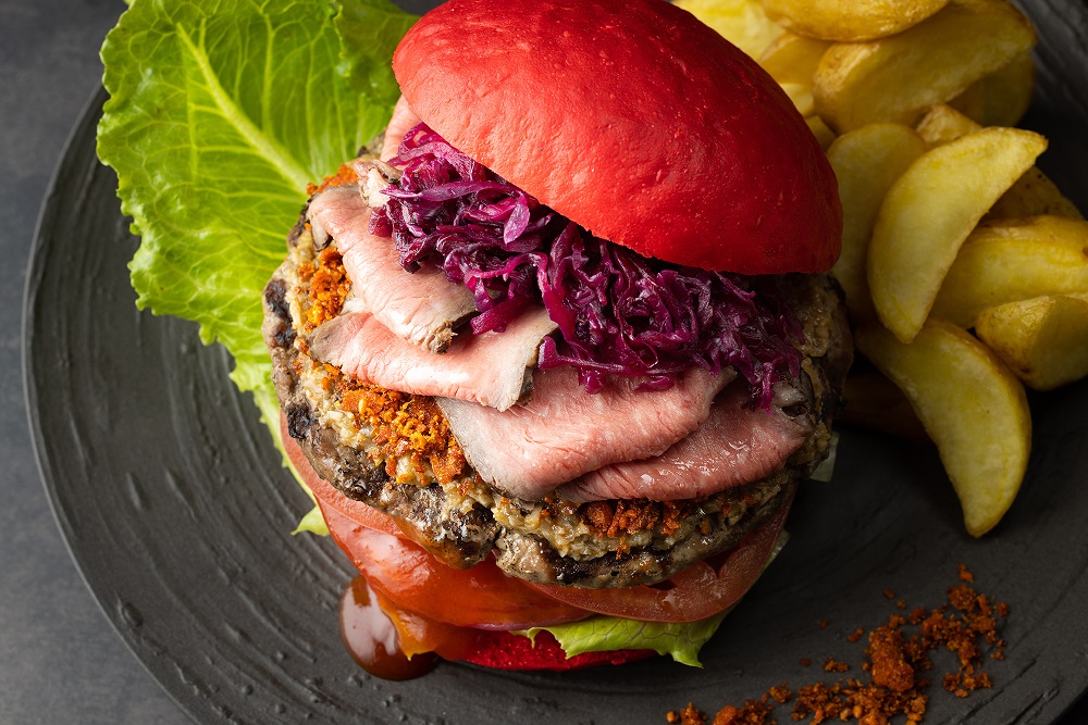 清涼感と辛さが絶妙にマッチする味を楽しめる赤いハンバーガーは、食欲をそそるシェフのアイデア光る一品です。