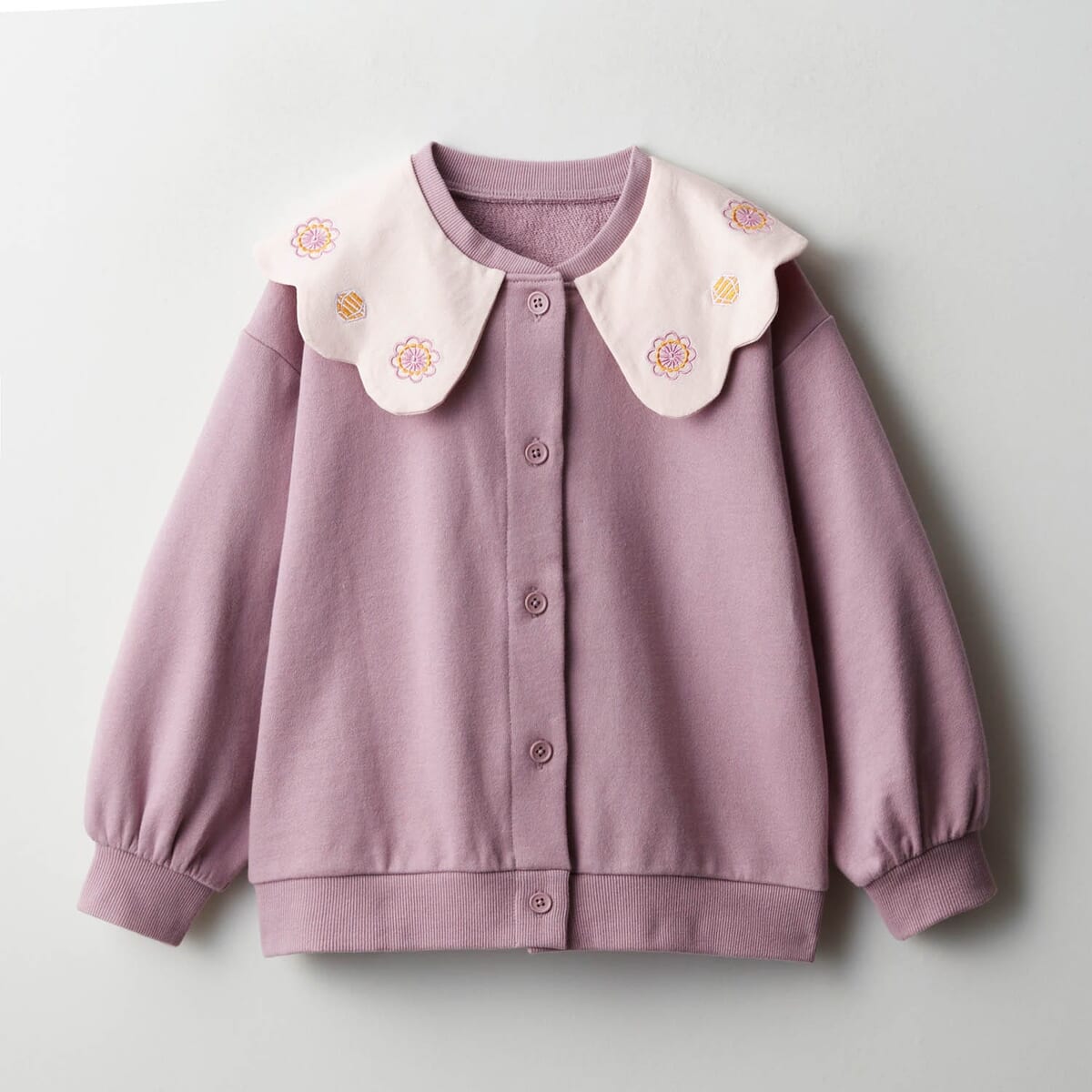 スカラップ襟に刺繍をあしらった上品でかわいいデザインのカーディガン。