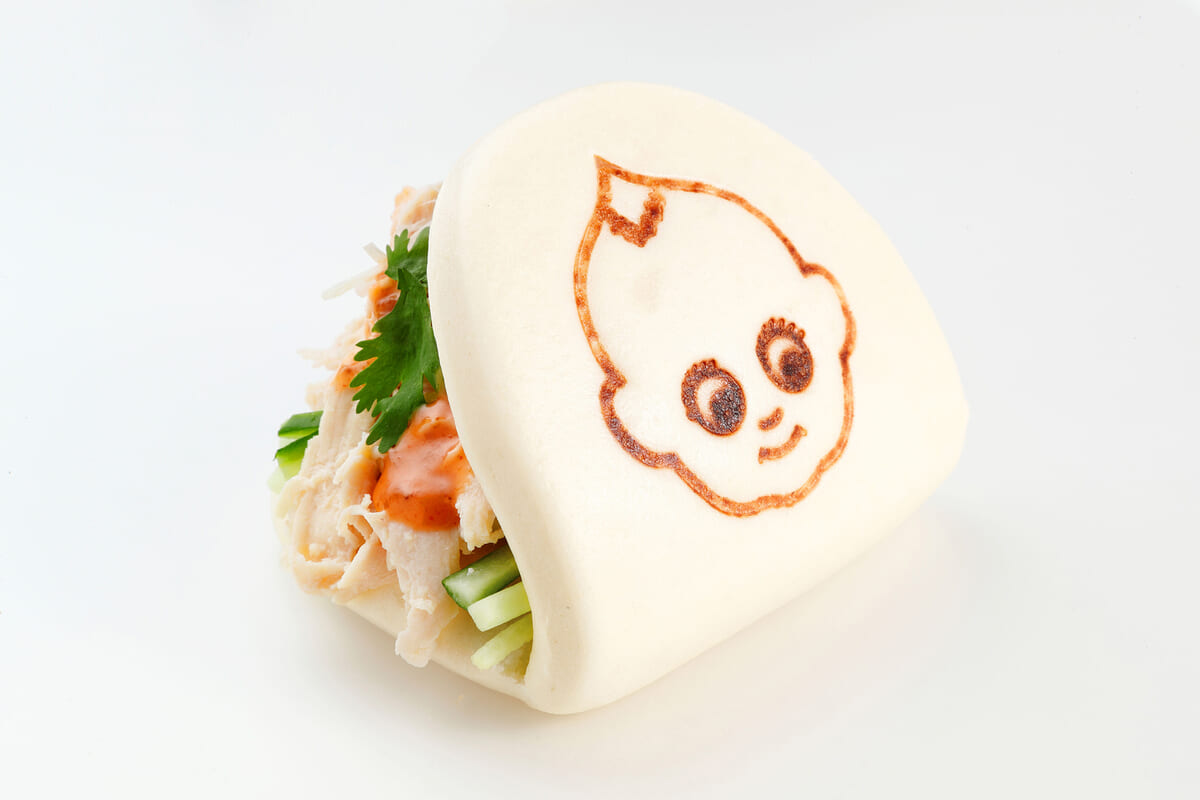 キユーピー人形の焼印を押したふわふわのバンズにさまざまな具材を挟んだ「キユーピーまん」