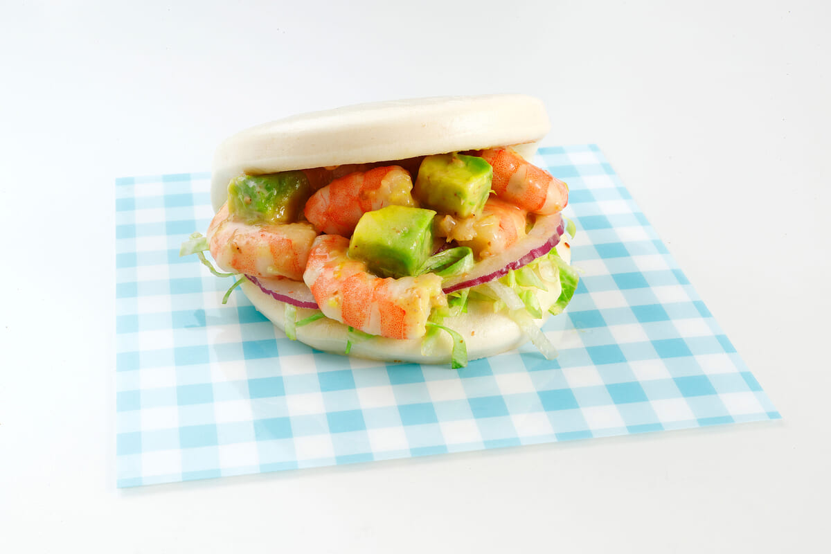 サラダで定番の組みあわせのエビとアボカドを、コリアンダーをきかせた深煎りごまドレッシングであえ、バンズにたっぷりと挟んだメニュー。