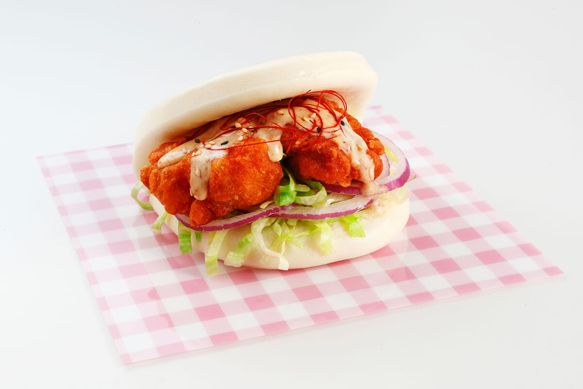 蒸したチキンに、唐辛子ベースのシラチャーソースを加えた深煎りごまドレッシングをかけた「キユーピーまん」