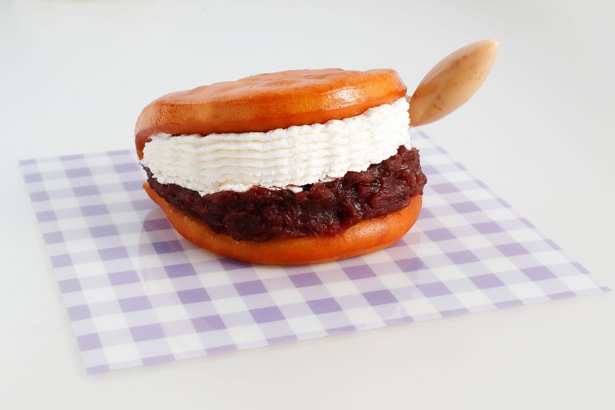 サクッと揚げたバンズであんことバニラアイスを挟み、ホイップクリームで飾ったスイーツ。