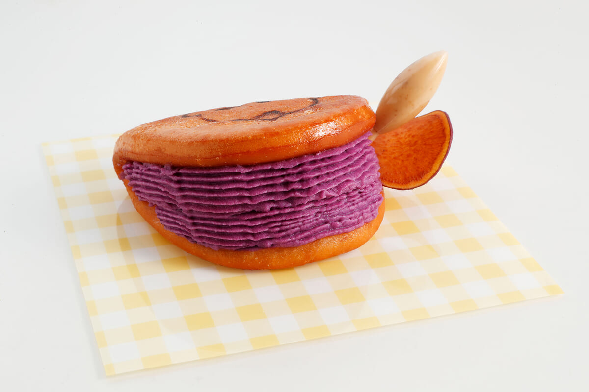 色あざやかな特製紫芋クリームとバニラアイスを揚げたバンズで挟み、さつまいもチップスを付けた「キユーピーまん」