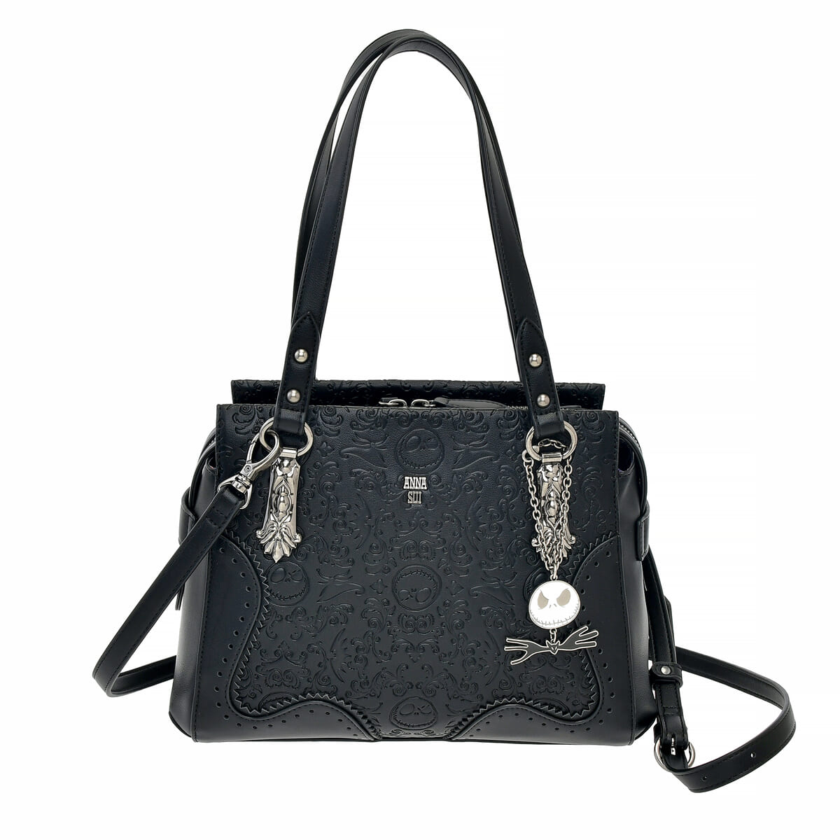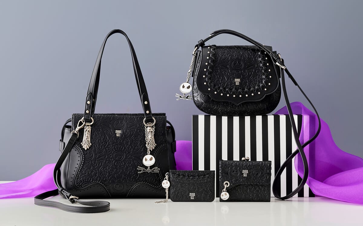 フェミニンで上品な「ANNA SUI」定番のバッグや財布に、「ジャック・スケリントン」をモチーフにしたオリジナルエンボス柄とアクセントのチャームがマッチした特別なデザインに仕上げられています。