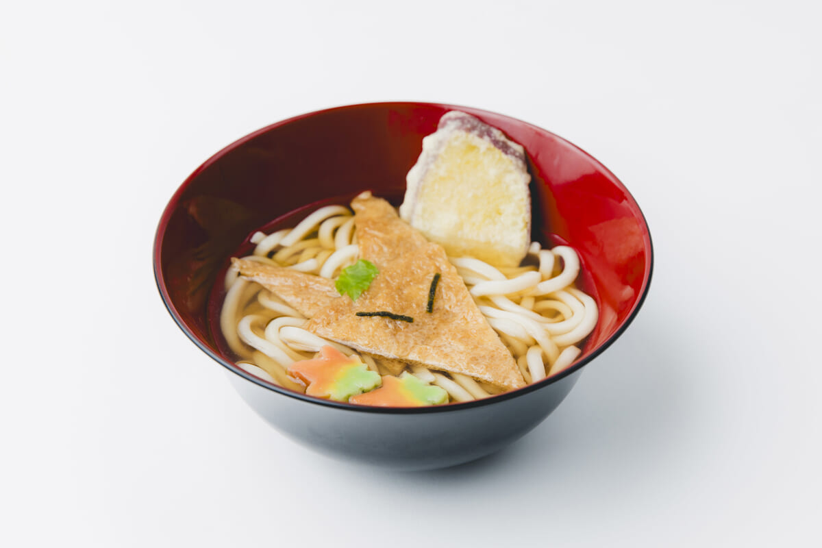きつねの好物”お揚げ”できつねのお顔を表現したきつねづくしのうどん。