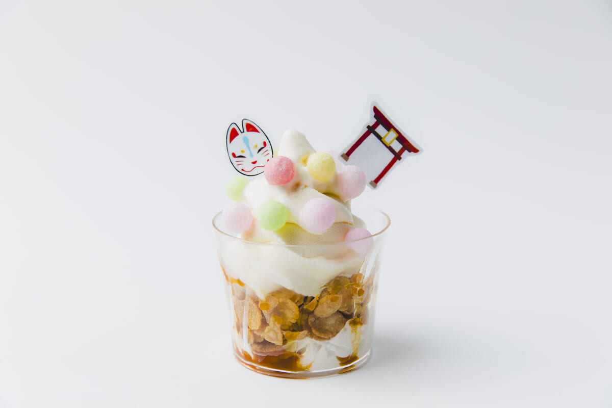 狐面と鳥居のモナカがのったミニパフェ。