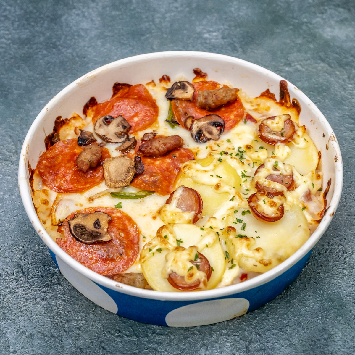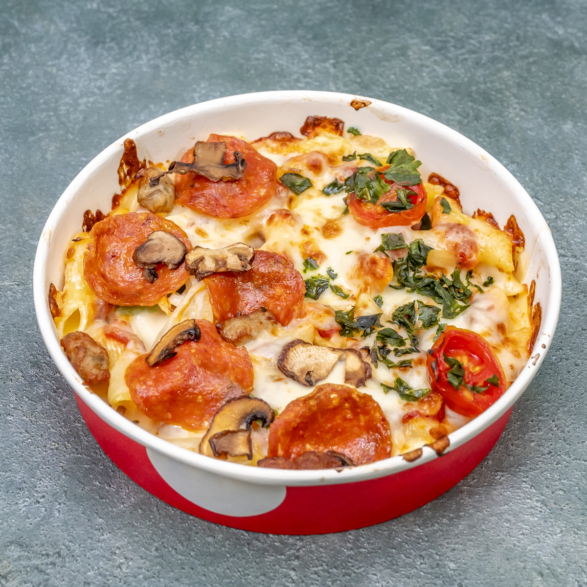 「ピザパスタボウル」は、ペンネの上にピザのトッピングをのせてオーブンで香ばしく焼き上げた新感覚ピザです。