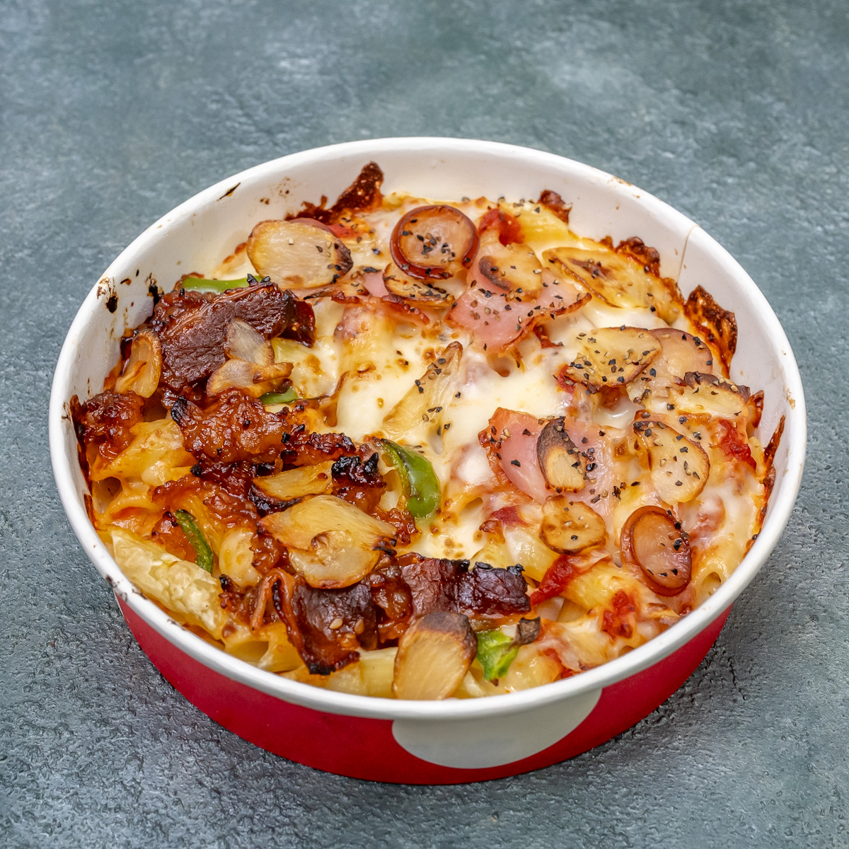 ペンネにピザのトッピングとチーズがたっぷりと絡み、それぞれのおいしさが融合した新感覚ピザです。