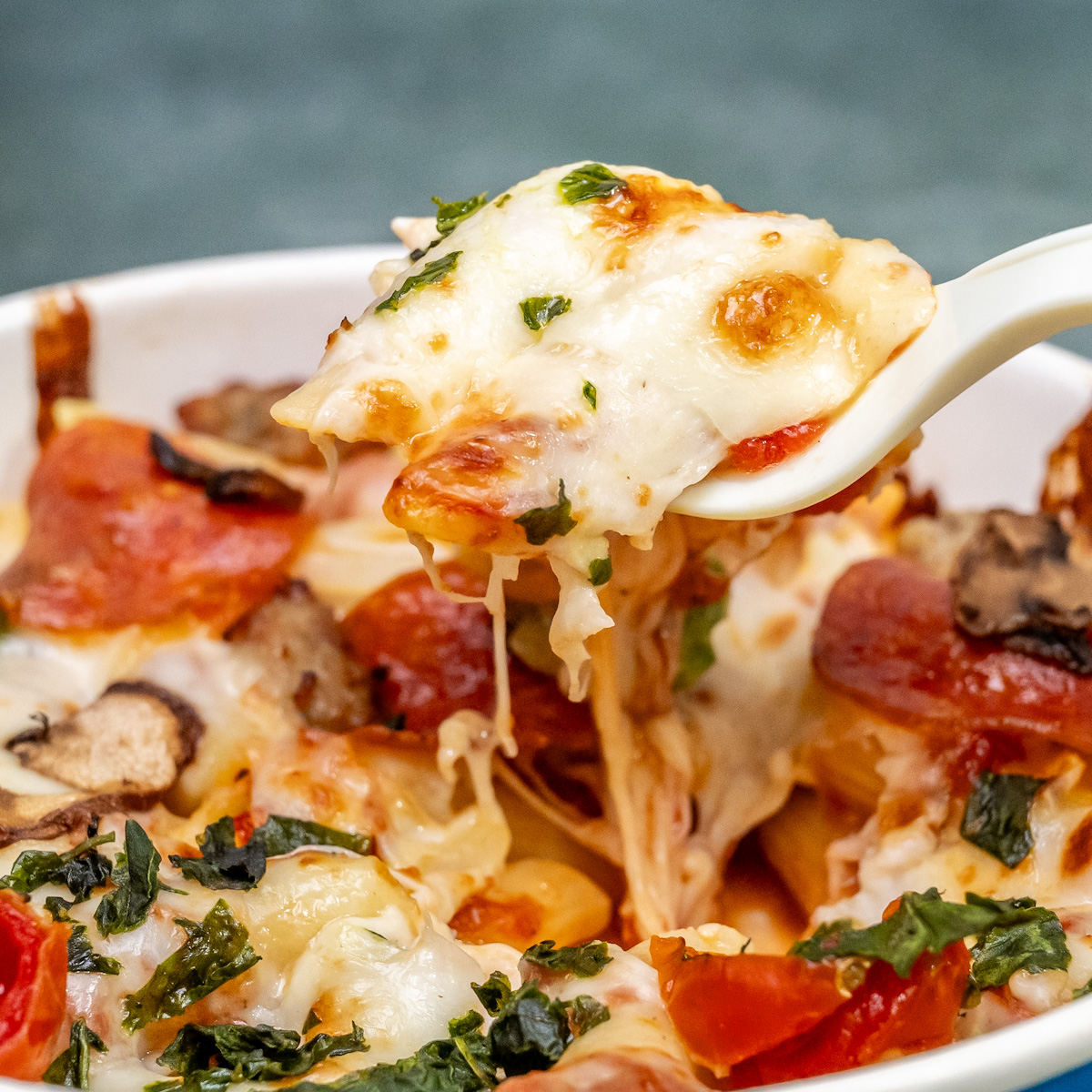ペンネと、モッツァレラチーズ、ピザとトッピングの旨みを存分に楽しめます。