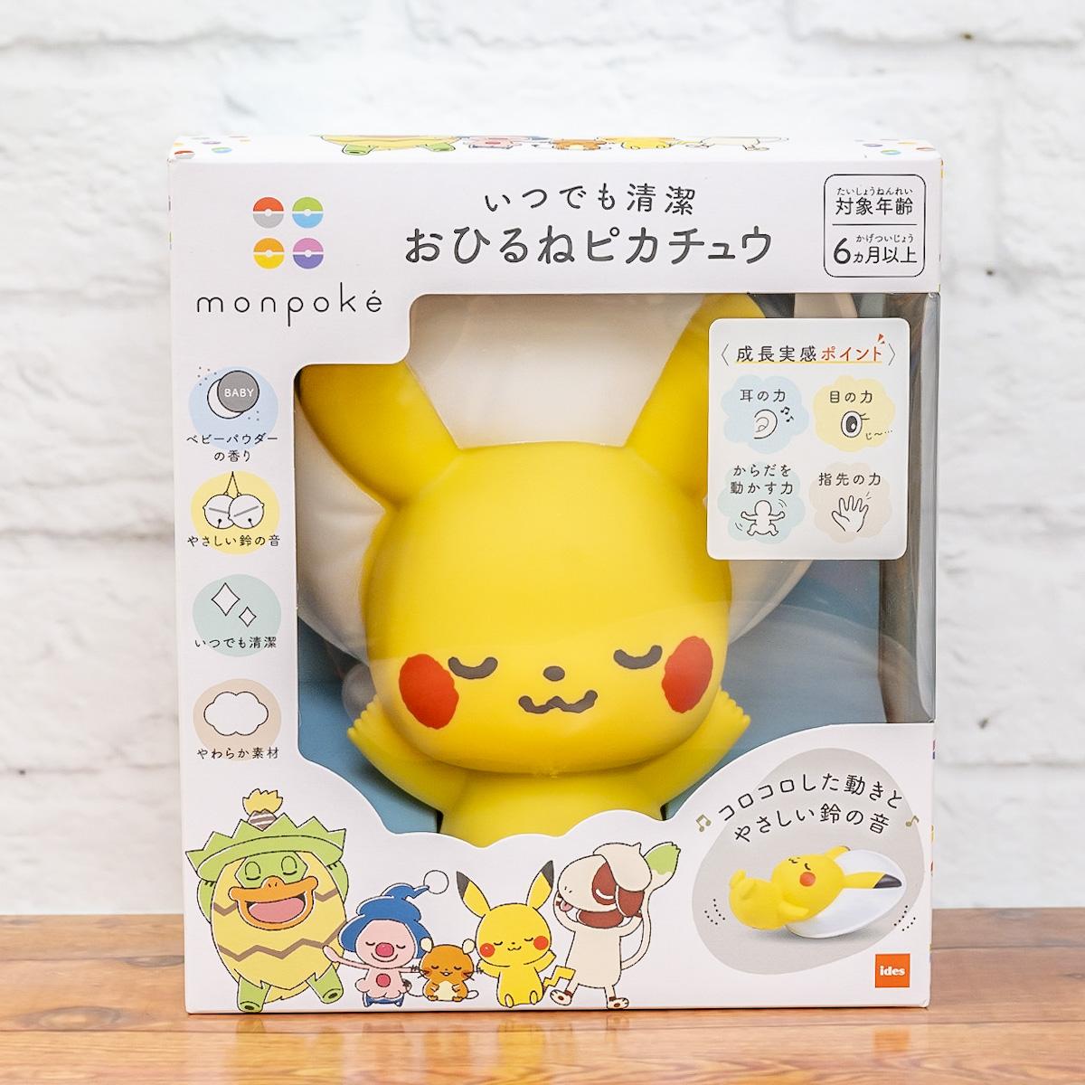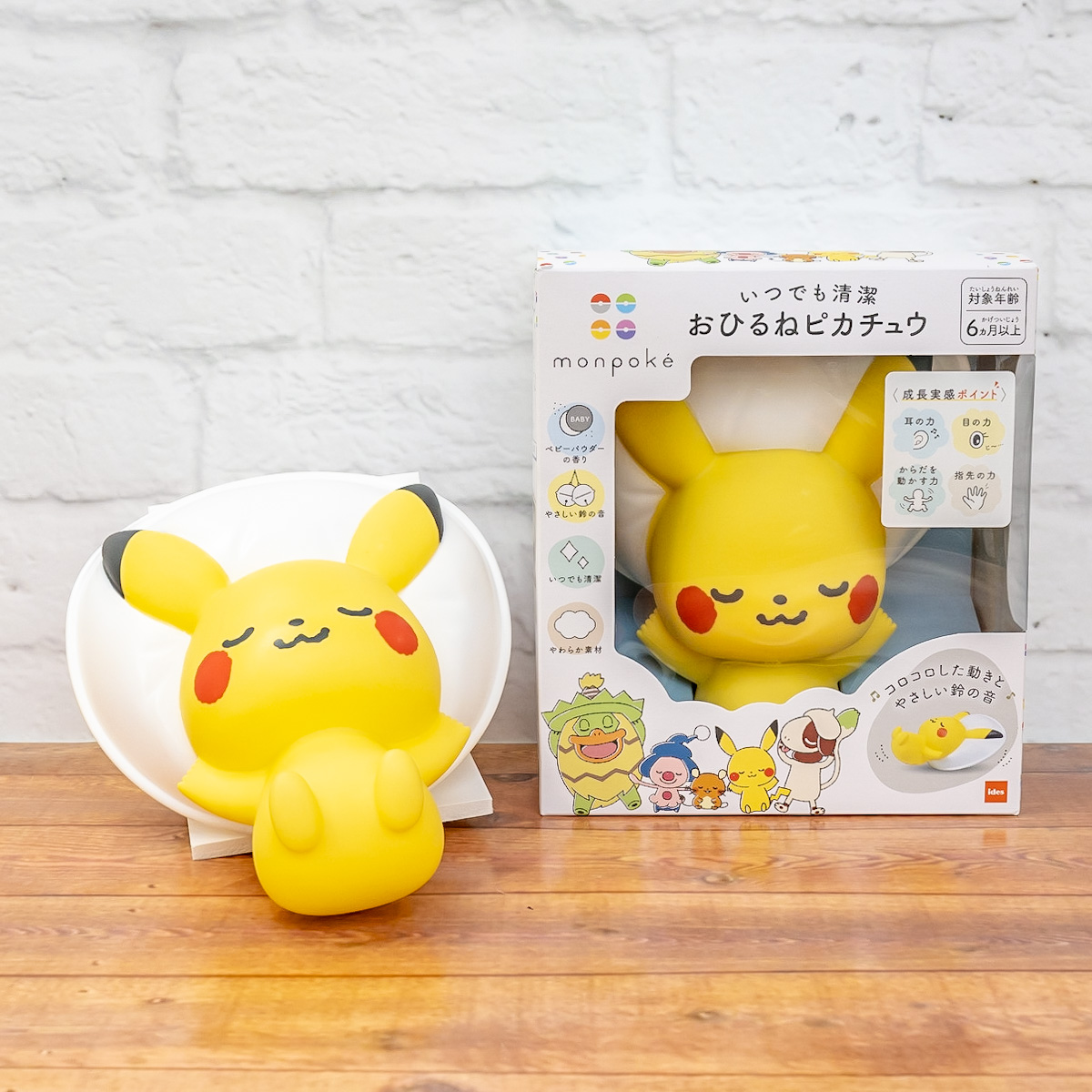 すやすやと眠るピカチュウの形をしており、コロコロ揺らしたり鈴の音を鳴らしたりして、6ヶ月から遊べるおもちゃです☆
