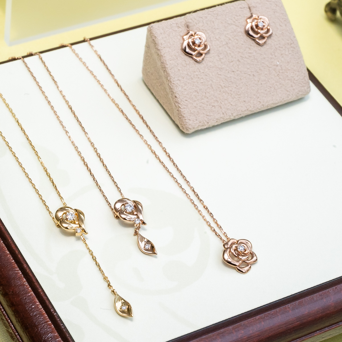 ピンクゴールドとガーネットの色合わせは、『美女と野獣』の物語の中のキーアイテム「魔法のバラ」を表現しています。